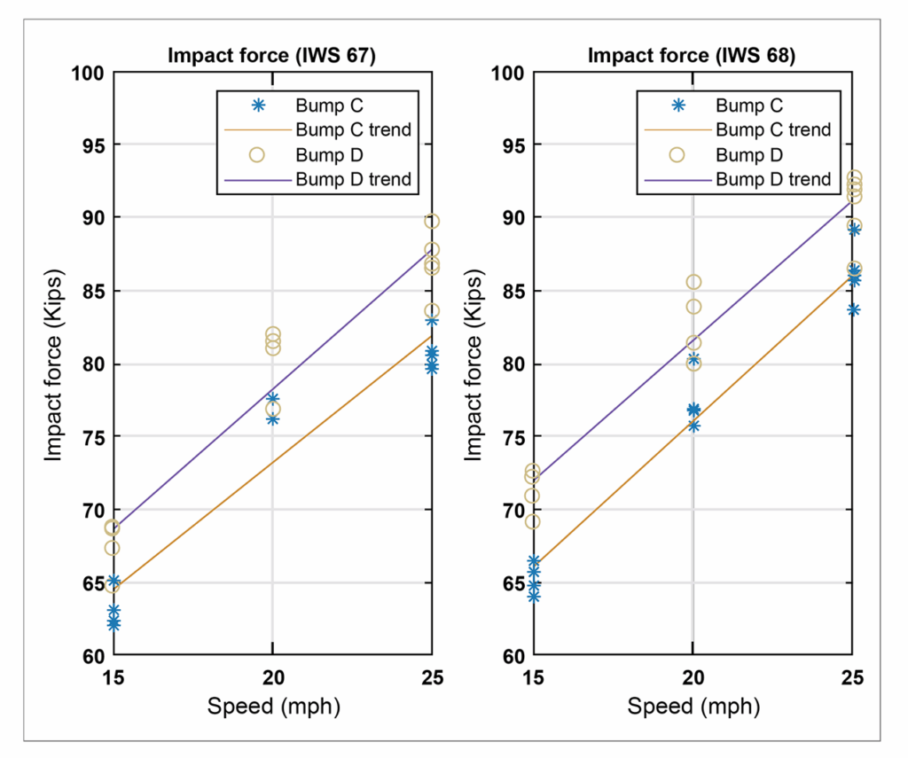 Different PRB thicknesses and test speed variations were successfully used to generate a range of vertical impact loads. Figure 1b illustrates the variation of impact force relative to the speed and bump type, demonstrating that impact loads increased with bump thickness. The trend between impact amplitude and test speed followed a linear trajectory over the speeds tested.