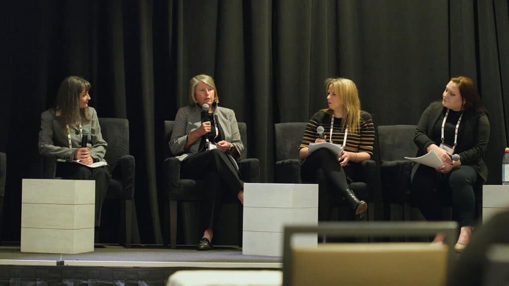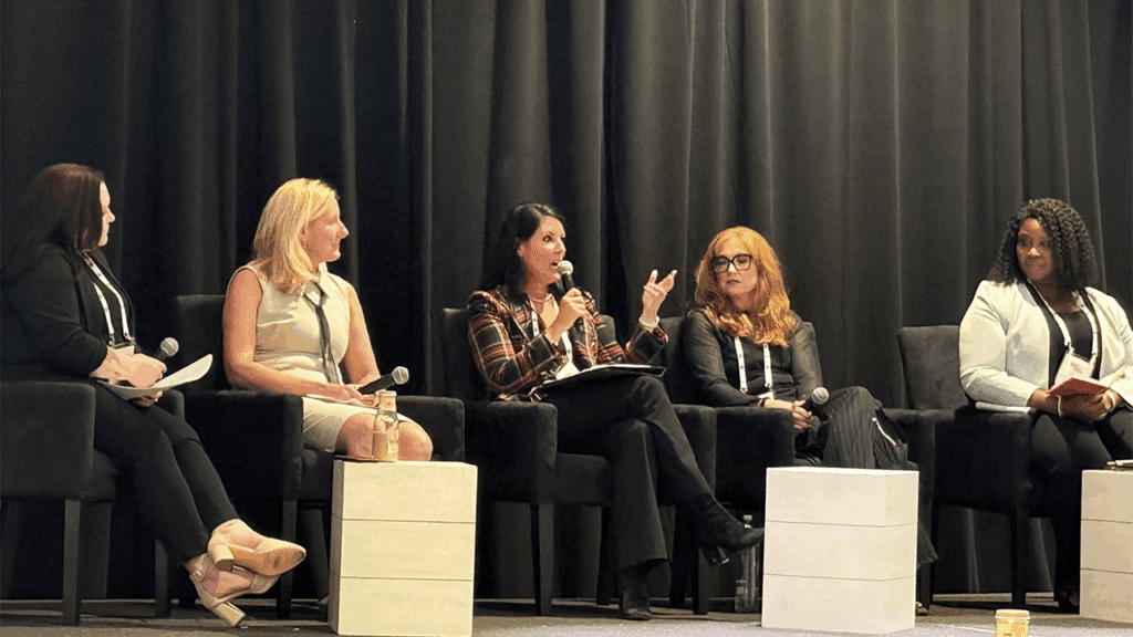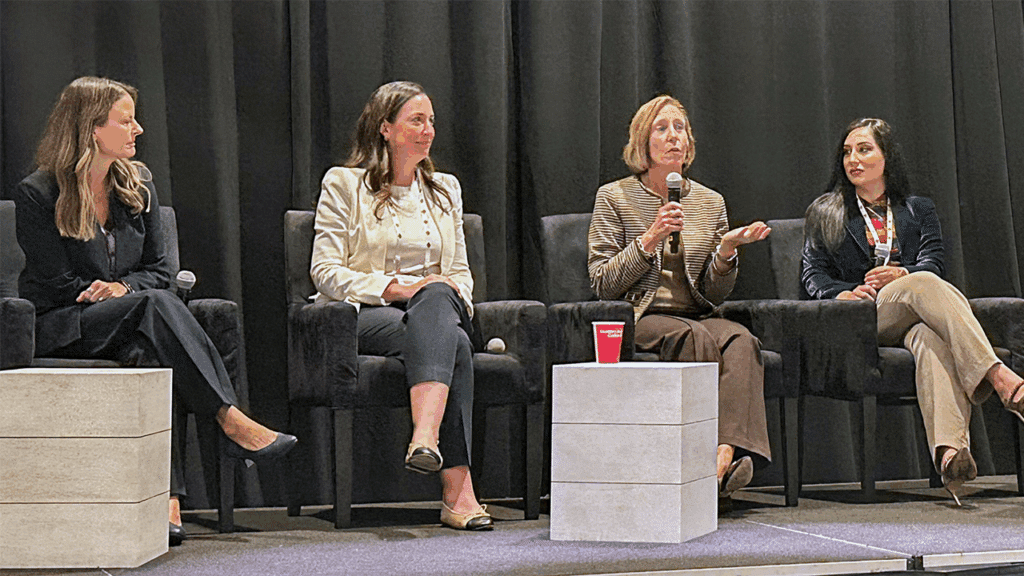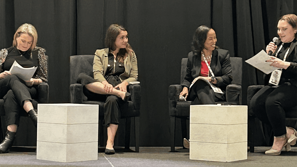 Christina Booth-Jackson, Vice President of IT for R.J. Corman and a 2024 Railway Age Women in Rail Award recipient (second from right), contributed insights on implementing IT systems that drive efficiency and allow employees to work smarter during the High-Tech Career Development and Industry Innovations panel. She was joined by Stacey Matlen, Senior Vice President of Innovation at The Partnership for New York City (second from left), which teams with startups to solve public transportation challenges for the largest transit agencies in North America. Leading the conversation were Carolina Worrell (far left) and Jennifer McLawhorn from Railway Age and RT&S, respectively. (Photograph Courtesy of R.J. Corman)
