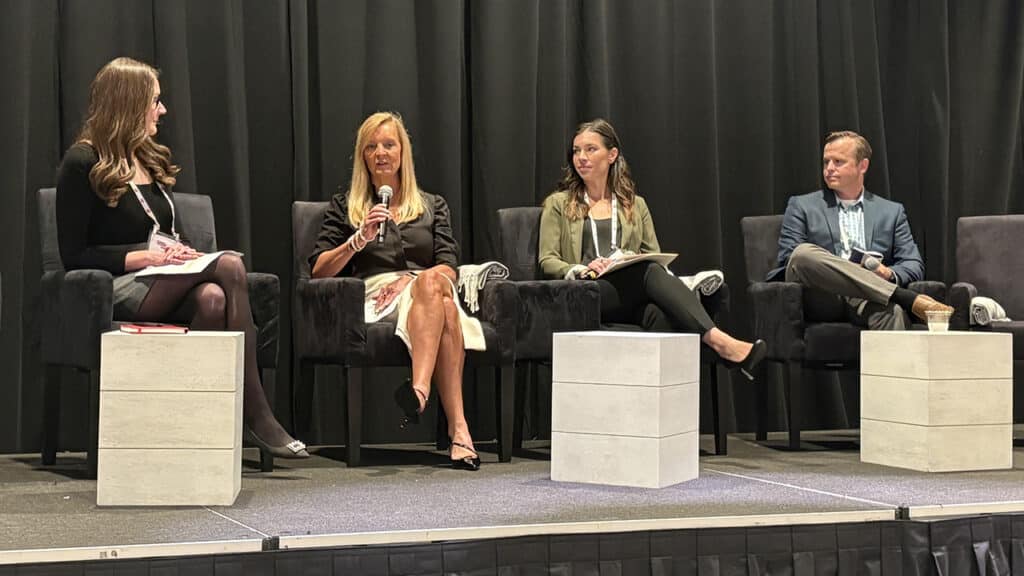 Taking the stage for our “Trackside Impact: Environment and Community” session were Kayden Howard, Senior Vice President, Health, Safety, and Environmental Programs, OmniTRAX (second from left); Sean Strong, Vice President of Environmental, Watco; and Brett Guarino, Project Manager, CSX Construction Engineering (2025 RT&S Women in Railroad Engineering Award winner; middle right). They covered how the industry is lowering carbon emissions through innovation, strengthening stakeholder engagement, and leading construction projects that deliver lasting, positive impacts, with moderator Lisa Tackach, Head of Marketing, Railroad Construction Company, Inc., and President, League of Railway Women. (Photograph Courtesy of Marybeth Luczak)