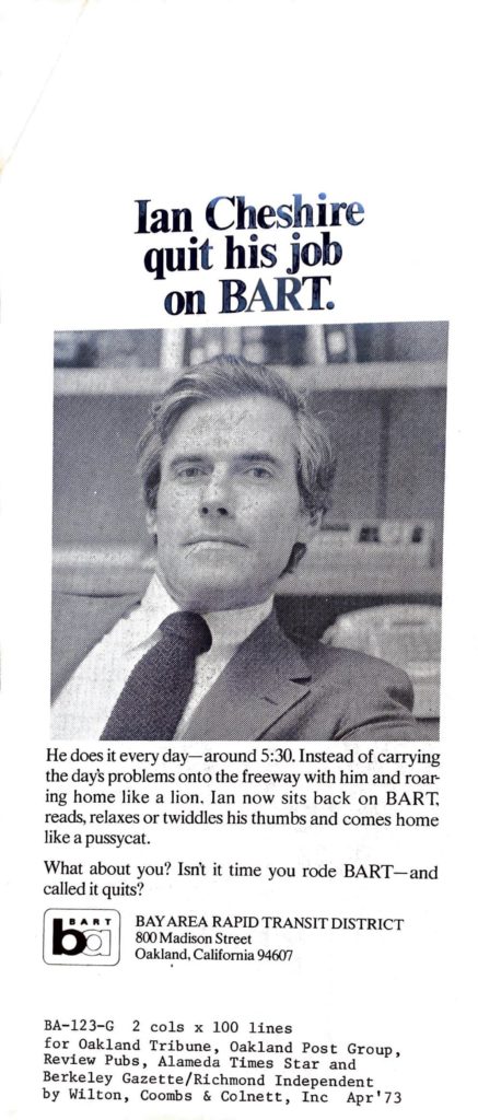 In one series of ads, created by an agency in the early 1970s, provocative text meets black-and-white image. “Ian Cheshire quit his job on BART,” one reads. “Fran Sheath left her husband on BART,” says another. The advertisements speak to a different time and era and were intended to inspire people of all stripes and backgrounds to give BART a try. In the 70s after all, mass rail transit at this scale was an entirely new concept for the Bay Area. People had to get used to the idea of BART – and feel compelled to give up their private automobile for it.