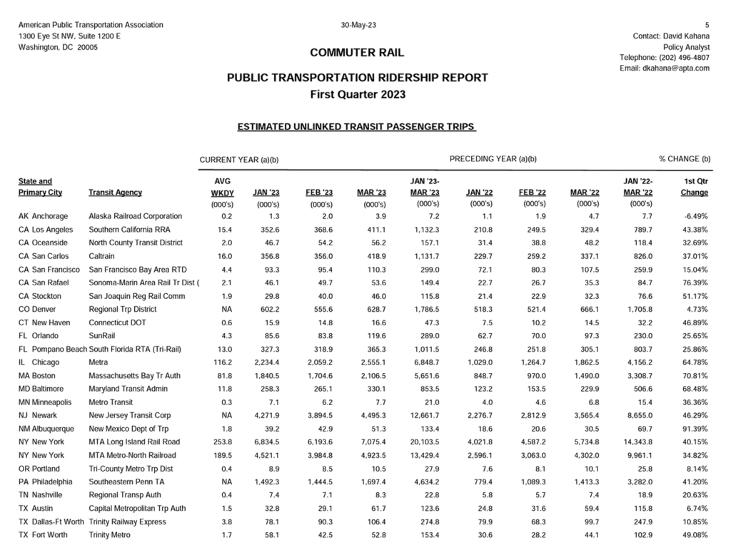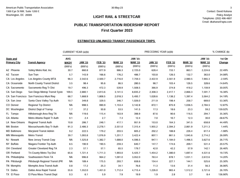 The American Public Transportation Association’s (APTA) first-quarter 2023 Public Transportation Ridership Report finds that the light rail/streetcar, commuter rail and heavy rail (rapid transit) categories were up by double-digits over the prior-year period. Among the agencies posting the highest gains: D.C. Streetcar (light rail/streetcar; up 139.02%), Virginia Railway Express (commuter rail; up 113.90%), and Washington Metropolitan Area Transit Authority (heavy rail; up 66.8%).