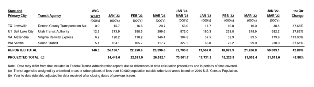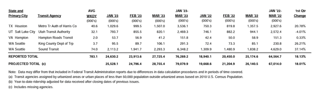 Data for Canadian agencies is not projected, APTA said; only the total for agencies that reported to APTA for the quarter is shown on the summary page.