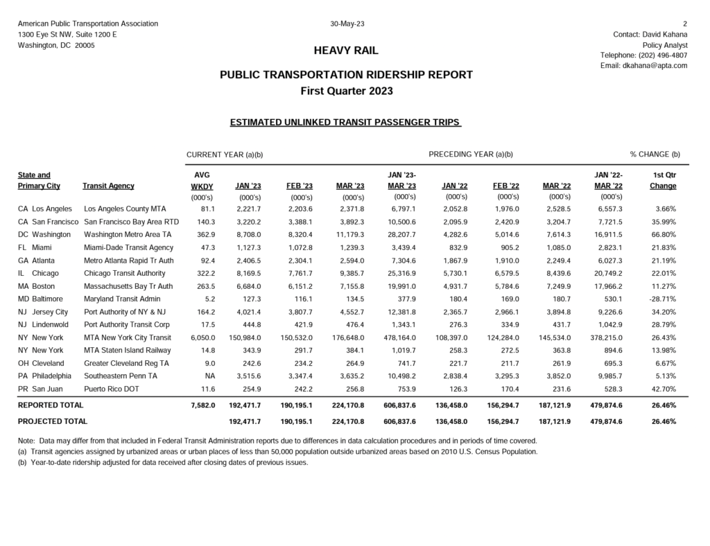 “For the rail systems (heavy rail, light rail, commuter rail and trolleybus) that do not report data for the current quarter, it is assumed that the percentage growth for a missing agency or agencies is equal to the percentage growth for the entire category,” APTA reported. “The national percentage increase for the category is applied to stored data values for any missing agencies in that category and the total estimated count is reflected in the ‘Projected Total’ line on each category page. Responding rail agencies represent 99.9% of ridership in those categories.”