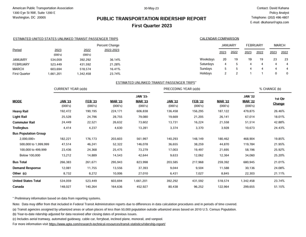 The Public Transportation Ridership Report (download first-quarter 2023 below) is a quarterly report of transit passenger ridership for U.S. and Canadian transit agencies, according to APTA. The report includes quarterly and year-to-date estimated unlinked transit passenger trips for the current and previous year by transit mode. Unlinked passenger trips are defined as the number of passengers who board public transportation vehicles, APTA reported on its website; passengers are counted each time they board vehicles no matter how many vehicles they use to travel from their origin to their destination. Additionally, agency specific ridership is provided for participating transit agencies.