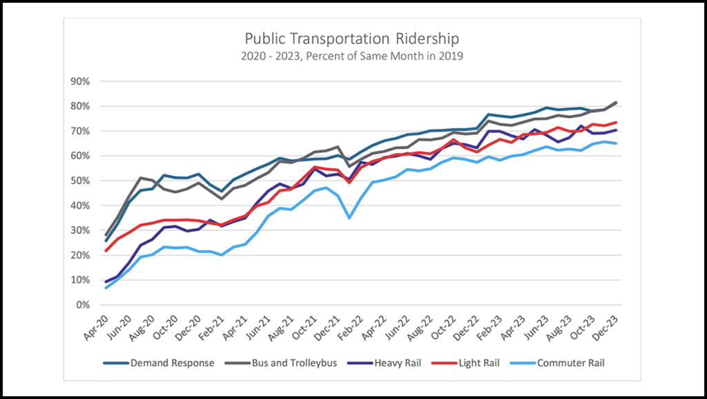“Return-to-office policies and a strong job market both have positive implications for public transportation ridership recovery,” according to the APTA report. “However, office occupancy rates remained flat at 50% throughout 2023, according to Kastle Systems. Regardless of slow office occupancy recovery, public transit ridership recovery has continued. This recovery indicates that transit agencies are having success in attracting non-commute trips. Current data remains limited, but indicators in several metro regions point to transit recovery being led by trips to and from residential and commercial areas as opposed to office/work centers. More time and data are needed to determine if this transit demand shift will remain the driving force for ridership return.”
