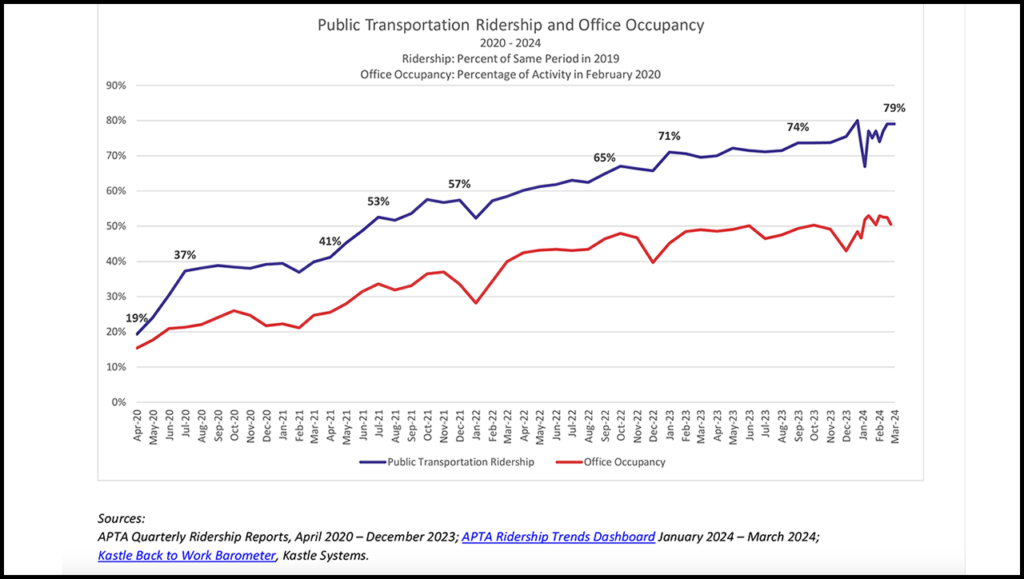 This chart details public transportation ridership from April 2020 to March 2024, and office occupancy rates in 10 cities for the same time period. Ridership data is from APTA’s 2020-2023 Quarterly Ridership Reports and APTA’s Ridership Trends Dashboard, while office occupancy data is courtesy of Kastle Systems. (Chart Courtesy of APTA)