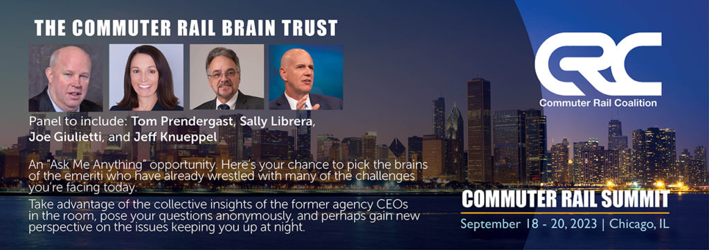 “Commuter Rail Brain Trust.” An “Ask Me Anything” opportunity to pick the brains of the emeriti who have already wrestled with many of the challenges agencies are facing today. Panel to include Tom Prendergast, Sally Librera, Joe Giulietti, and Jeff Knueppel. Moderated by Railway Age Editor-in-Chief William C. Vantuono