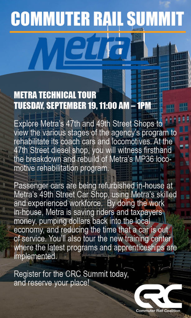 On the agenda are roundtable discussions, fireside chats with industry leaders and technical tours—two major new starts projects on the Northern Indiana Commuter Transportation District (NICTD), plus Metra’s 49th Street railcar rehab facility—as well as “next-level networking with thought leaders, policymakers and stakeholders from across the industry to prepare for the challenges and the unprecedented opportunities awaiting commuter railroads,” says CRC Executive Director KellyAnne Gallagher. “This event has much to offer agency CEOs, deputies and CXOs; operations, safety, marketing and public/government affairs team members; and OEMs, suppliers, consultants and contractors working with commuter railroads.”