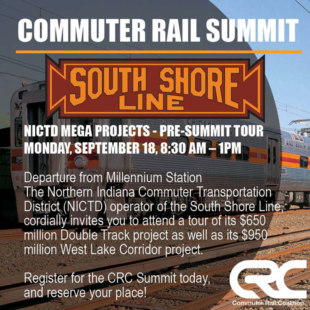 Northern Indiana Commuter Transportation District (NICTD) tour of the $650 million Double Track Corridor and $950 million West Lake Corridor projects. A Commuter Rail Coalition special will depart Millennium Station, travel along the Metra Electric District right-of-way and the South Shore Line to Hammond, Ind., to be met by buses that will travel the project area and see the progress being made on these two New Start projects.