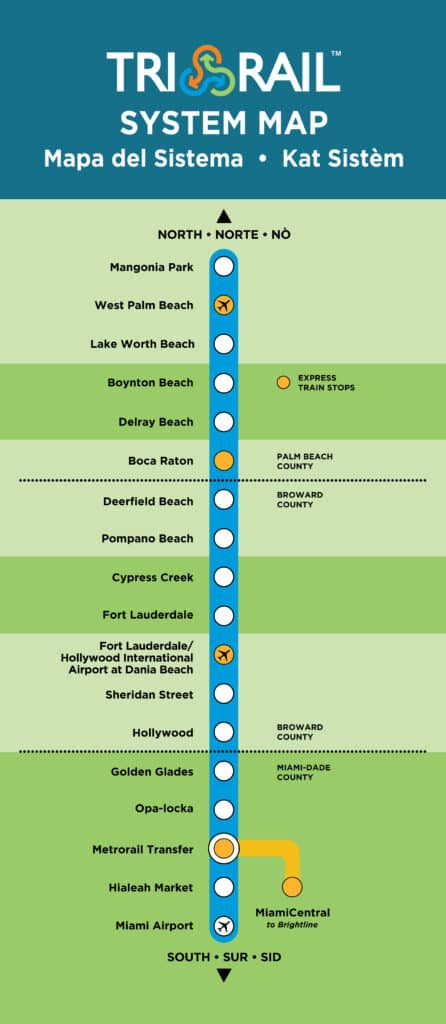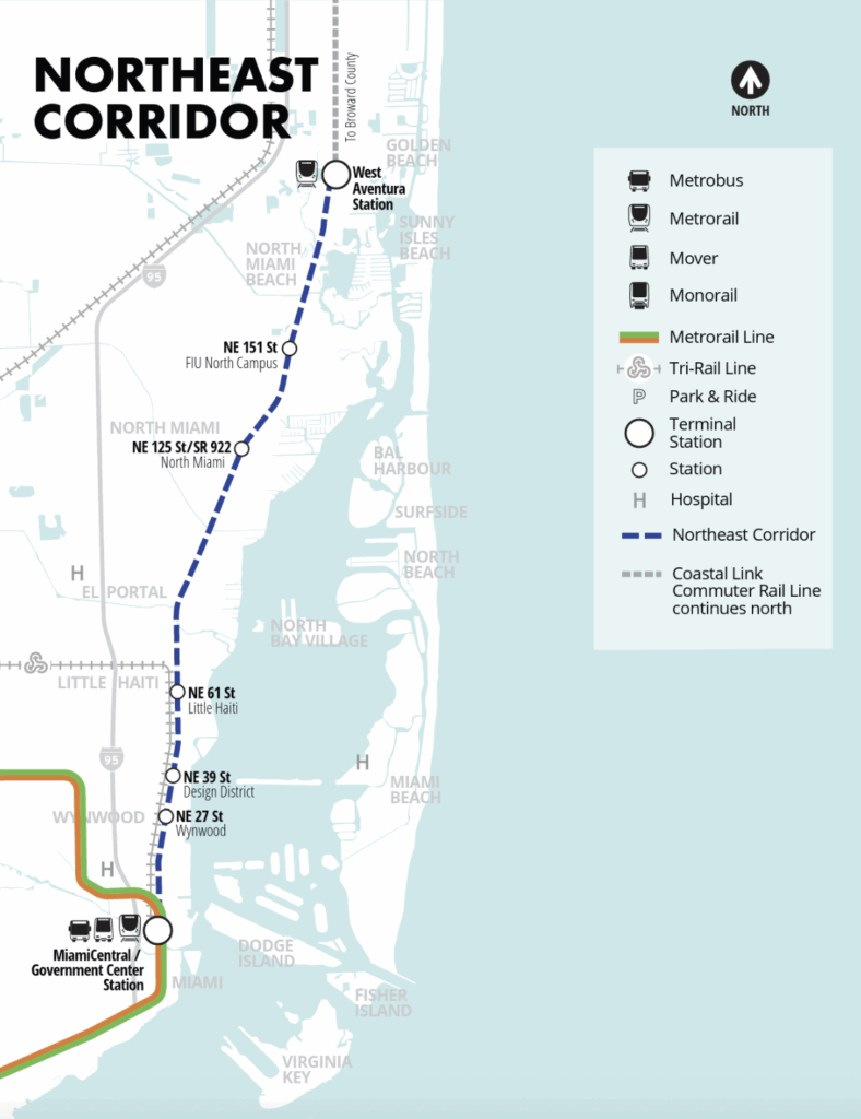 As we have reported over the years, Brightline is also planning Coastal Link, a similar service on its own line, which is located in coastal areas (see map, right). Most of Tri-Rail operates along the historic Seaboard Railroad’s line, which is several miles inland from the FEC route for most of the length of its line. Brightline and Tri-Rail both run service from Brightline’s Miami Central Station in downtown Miami, and both railroads have stations in West Palm Beach, which are a few blocks apart. Miami-Dade County described the Coastal Link project, which would provide a full, seven-day span of service, this way: “The Northeast Corridor marks the first segment of the 85-mile Coastal Link commuter rail, designed to seamlessly connect Miami-Dade with Broward and Palm Beach counties. This 13.5-mile project will establish a new rapid transit route from Miami Central Station in downtown Miami to West Aventura Station, utilizing the existing railroad corridor shared with Brightline and freight services. The goal is to provide residents, businesses, and visitors with a reliable and efficient transportation option.” The line is not to be confused with Amtrak’s Northeast Corridor, but the service pattern would be similar to Amtrak’s NEC: trains every 30 minutes at peak-commuting periods and every 60 minutes at other times, including on weekends. There would be new stations at Wynwood, Design District, Little Haiti, North Miami Beach, and FIU North Campus. There are also other plans to introduce that type of service in Broward and Palm Beach counties. That plan was revealed in 2023. FECR alleged that Brightline planned to run 54 “commuter” trains daily under the plan, the Herald reported.