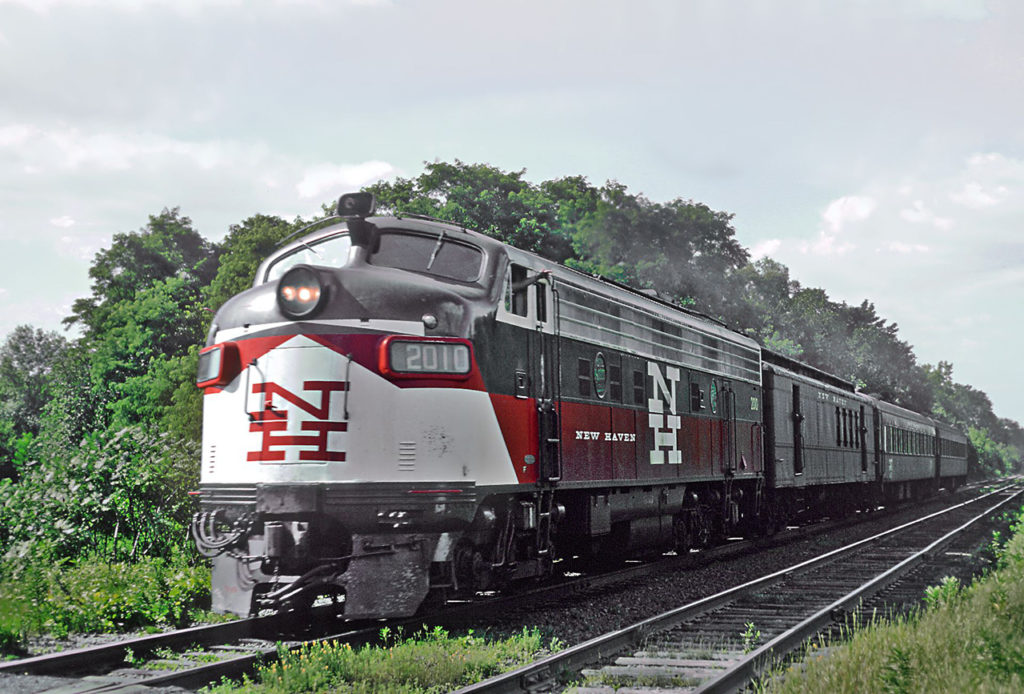 New Haven FL9 2010 with Train 83, a Springfield, Mass.-New York City train, near Enfield, Conn., July 20, 1968. Photo: Roger Puta, Wikimedia Commons