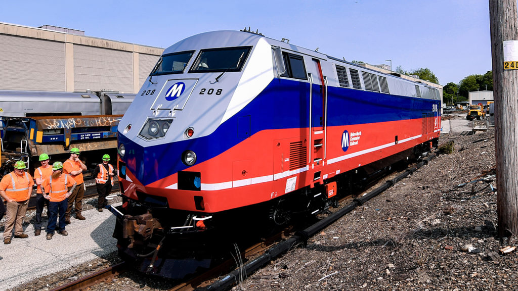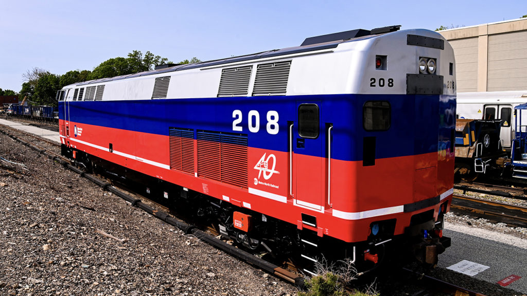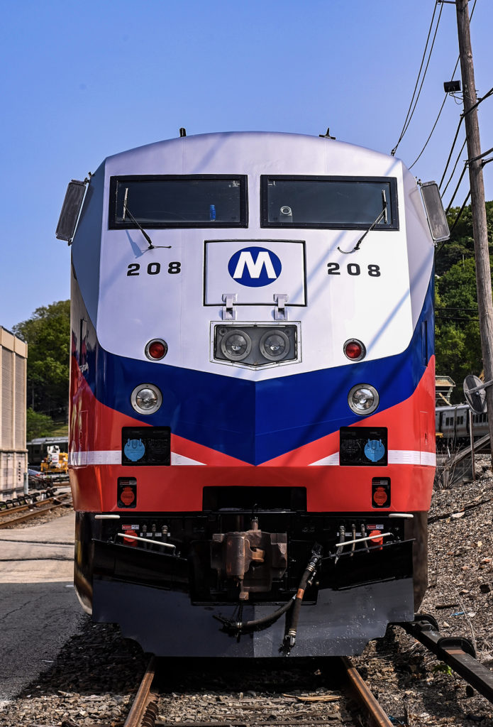 Craft workers at Metro-North’s Plains Maintenance of Equipment Repair Facility applied a vinyl wrap to P32ACDM No. 208, the first locomotive to be rebranded, and one of 31 such units the railroad uses on its northern Hudson and Harlem Lines and the New Haven Line’s Danbury and Waterbury Branches. The silver, blue and red livery pays homage to Metro-North’s original design created upon the railroad’s founding in 1983 and applied to its dual-mode (diesel/third-rail) FL9 locomotives and worn by them until the last unit was retired in April 2007.