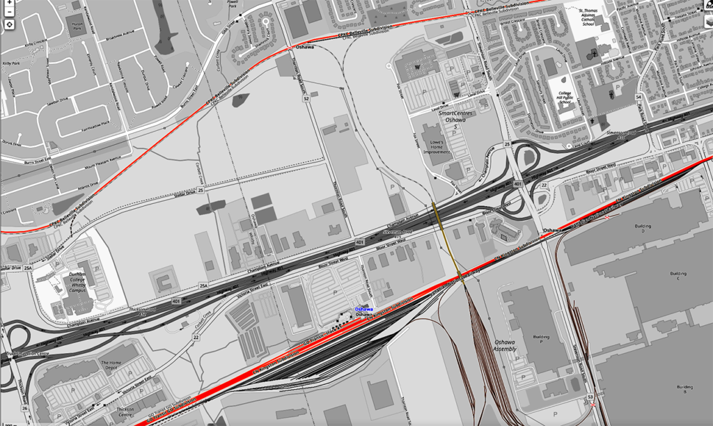 Existing GO Transit/CN/CPKC railway infrastructure in Oshawa. OpenRailwayMap.org screenshot.