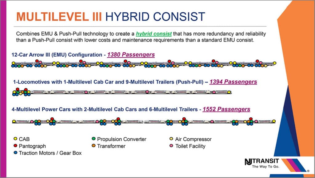 The Multilevel (ML) III, an evolution of the ML I and II railcars currently in service, is a “hybrid” EMU (electric multiple-unit) and described as the first of its type in North America. There are three variations: Power Car, Trailer Car and Cab (Control) Car. With options, NJT has ordered 174: 40 Cabs, 18 Restroom-Equipped Trailers, 44 Trailers and 72 Power. The ratio is one Power Car to two Trailers; thus, the smallest consist is three units comprised of a Power Car sandwiched in between two Cabs. Train size is limited only to platform length; NJT could operate trainsets as long as 16 units, though typical consists will most likely be be 10-12 cars.