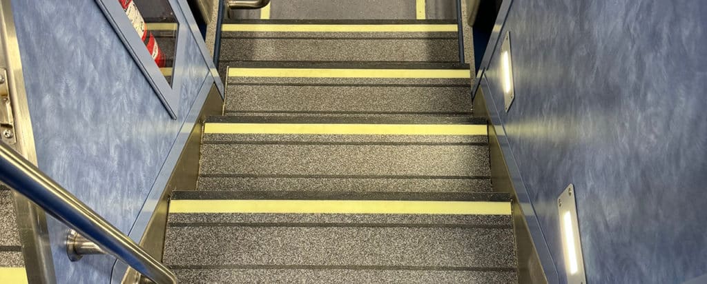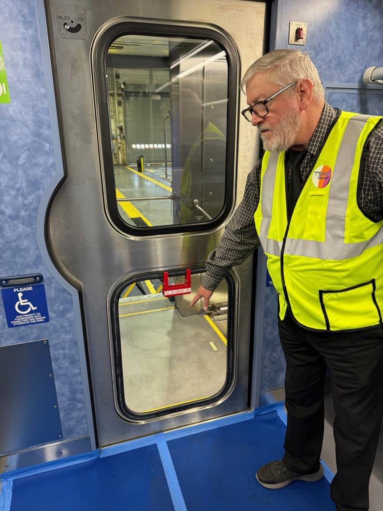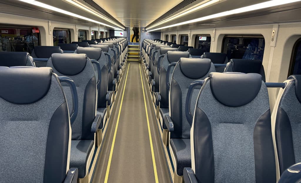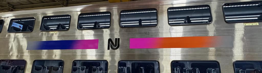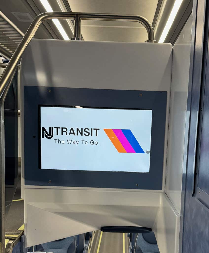 ML III passenger amenities include USB charging ports (USB 2.0 and USB C) and LED information displays. New safety features include anti-skid strips and foot treads, touchless restroom equipment, LED lighting, security cameras, removable vestibule door windows, and onboard bridge plates for wheelchair accessibility. There’s also an updated version of the NJT tricolor logo design by railway industrial designer Cesar Vergara more than 20 years ago.