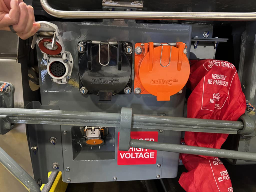 But even if a road failure occurs, a trainset can continue moving (albeit at a lower speed), as Power Car traction equipment is fully redundant—four traction motors (two per truck), two HEP (Head-End Power) units and two sets of transformers and voltage converter/inverter modules. Power Cars, rated at 35,968 foot-pounds (160 kN) starting tractive effort and 3,082 HP (2,300 kW) traction power at the wheels, also feature regenerative braking, and four sets of 27-pin trainline and air brake connections (two sets per car end). New advanced technology includes IP cabling (four receptacles per car) for feeding trainset data communications (health monitoring, fault codes, etc.) to Cab Car displays in the engineer’s cab. The cars are also equipped with ACSES (Advanced Civil Speed Enforcement System) Positive Train Control, as required by federal law.
