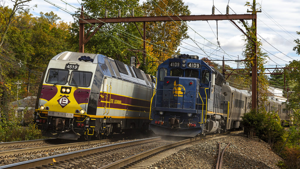 Heritage schemes: New Jersey Transit ALP45-DP 4519 in Erie-Lackawanna colors and GP40PH 4109 in its original Jersey Central Lines livery at Millburn, N.J., on the Morris & Essex Line. NJ Transit photo.