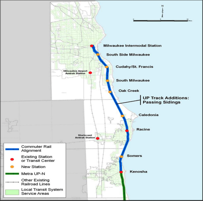 According to the profile, the Wisconsin Department of Transportation (WisDOT), in conjunction with the Wisconsin Transit & Realty Group, LLC (WTRG), proposes to implement commuter rail service along a 33-mile existing, active freight rail corridor from downtown Kenosha, Wisc., continuing through Racine and on to the Milwaukee Intermodal Station (MIS) in downtown Milwaukee. The line is expected to serve nine stations—three existing and six new—and provide a connection to Metra’s Union Pacific-North (UP-N) commuter rail line in Kenosha.