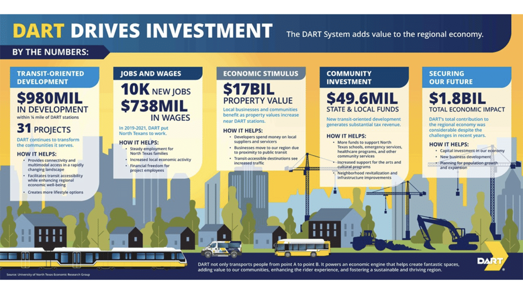 Conducted by the University of North Texas Economic Research Group (ERG), the study (download below) evaluated real estate development within a quarter-mile radius of light rail stations at DART, whose 700-square-mile network of light rail, Trinity Railway Express commuter rail, bus, GoLink on-demand, and paratransit services moves more than 220,000 riders per day across 13 cities in the Dallas/Fort Worth (DFW) area. It utilized IMPLAN software to create detailed economic models based on development spending data.