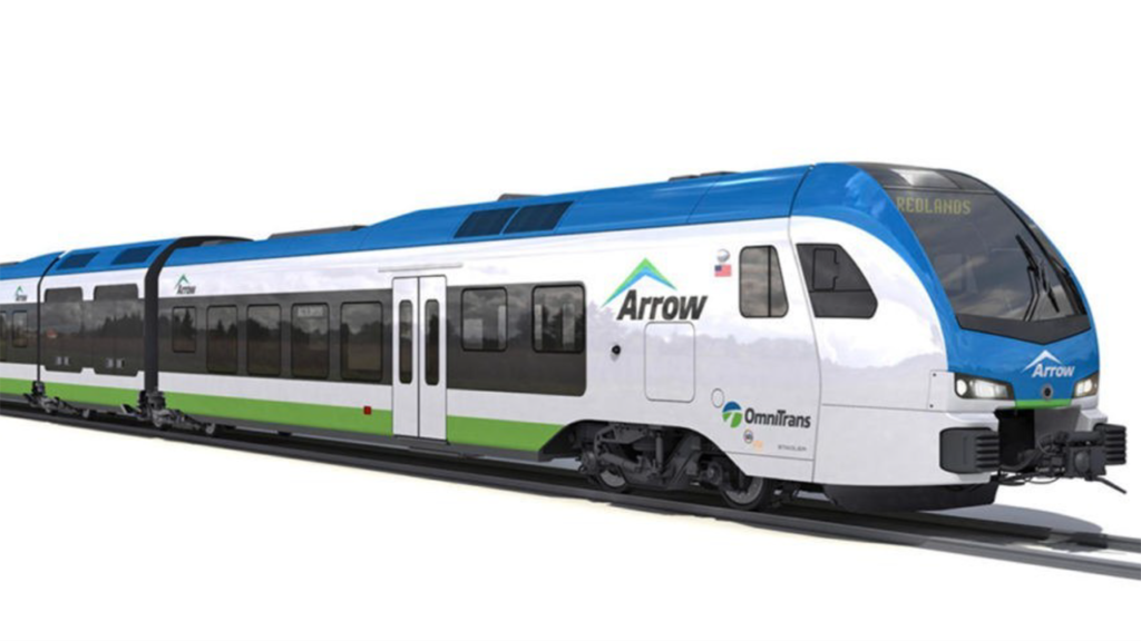 Stadler FLIRT H2 Arrow: The State of California purchased 29 HFC powered trains.The FLIRT H2 has a passenger capacity of 108, top speed of 130 kph (79 mph), and a 1,000 km (621 mile) range before refueling is needed. In the U.S., the Stadler FLIRT Arrow is expected to be in revenue service by 2024, on the OmniTrans system in San Bernardino County, Calif. It will be the first of its type in the U.S. The San Bernardino County Transportation Authority (SBCTA) awarded the contract to Stadler.
