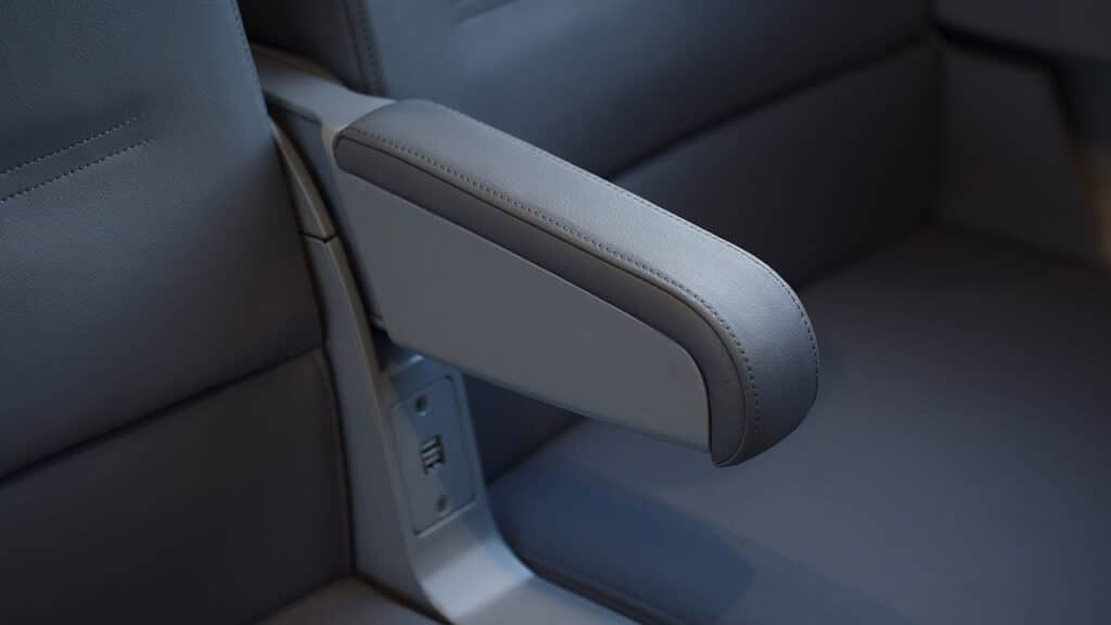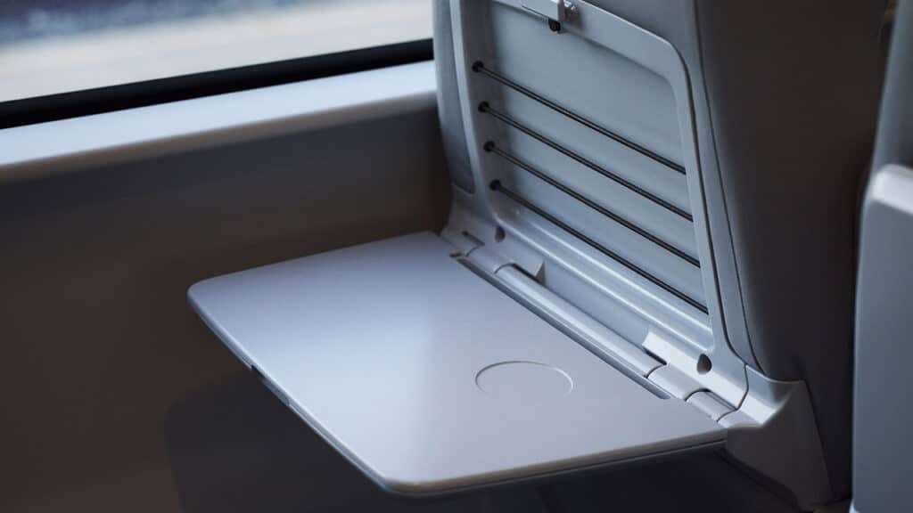 - Two-tiered, fold-down at-seat tray tables. They’re light, a vast improvement over the current, anvil-like tray tables that often get stuck when you’re trying to slide them out. (“Damn tray. It won’t move! Oops! There goes my drink!”)