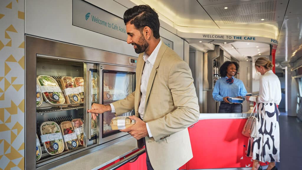 - Each nine-car trainset will seat 378. There will be seven “Acela Class” cars (replacing “Business Class”) with 49 to 59 seats; one “First Class” car with 44 seats; and one Café car with no seats (not even bar stools, so don’t even think about hanging out with a laptop. Just get your food and libations and head back to your seat!). The Café car will have, in addition to an attendant providing hot food, “self-select” refrigerators. These are not vending machines. You get what you want and pay for it at the counter. Amtrak calls this “convenient dining options, offering easy access and greater selection.” Well … we’ll see. Just don’t get rid of the Angus cheeseburgers, OK?