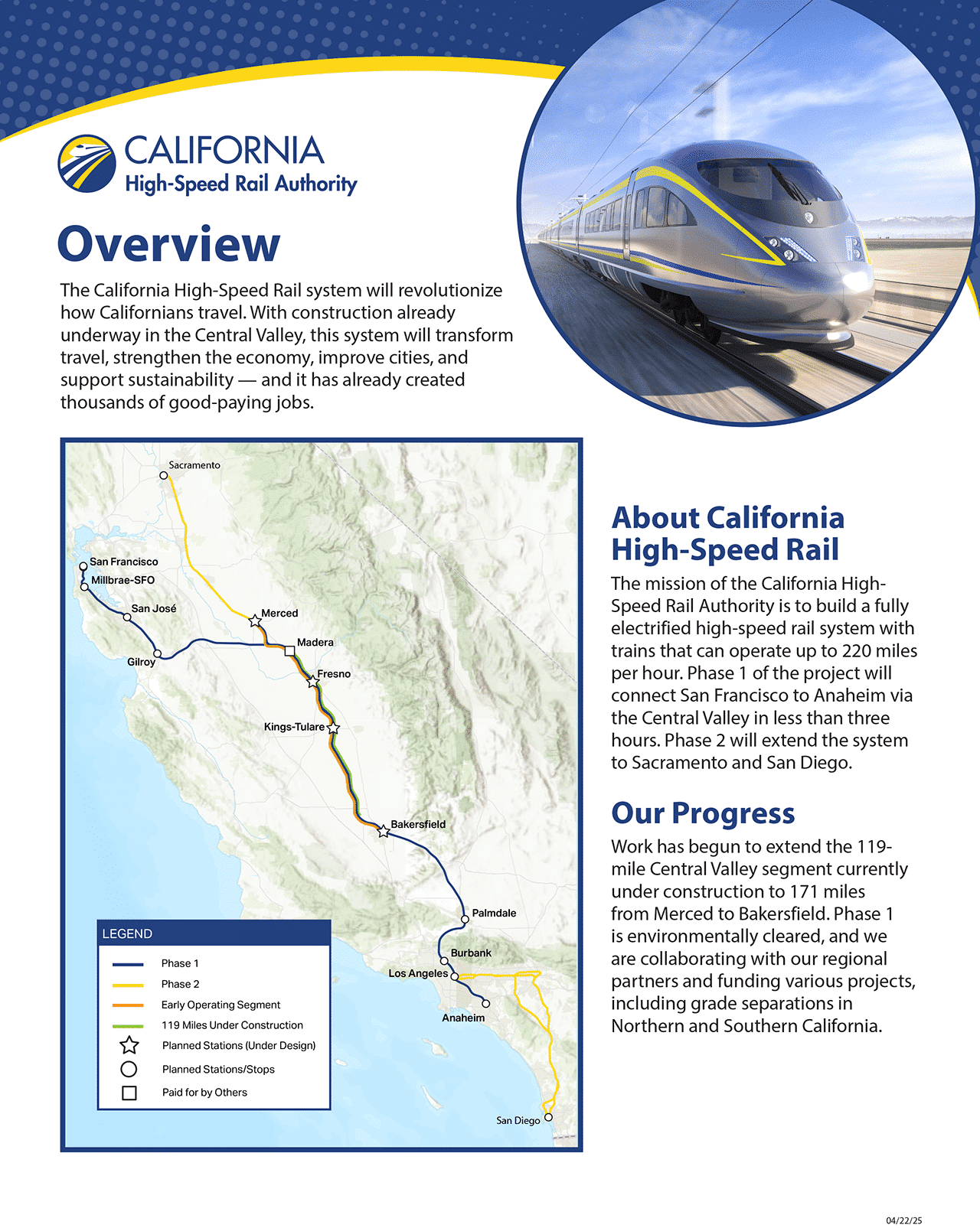 Business plans are published in even-numbered years (click here for the 2024 plan). They represent the status of the high-speed rail program at a point in time, and summarize the Authority’s approach to implementing the system. Business Plans include: