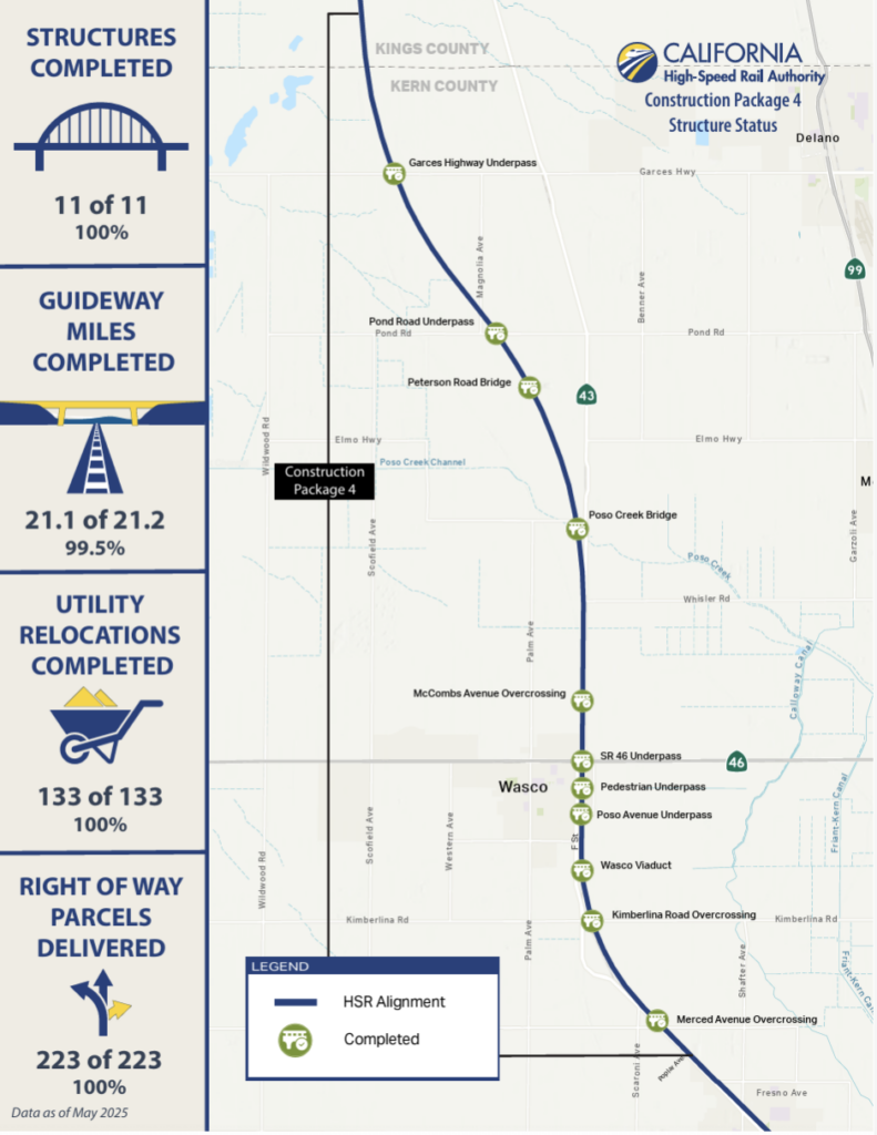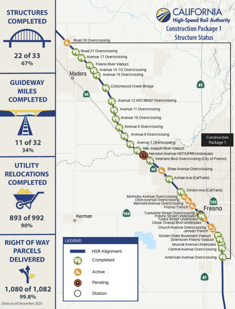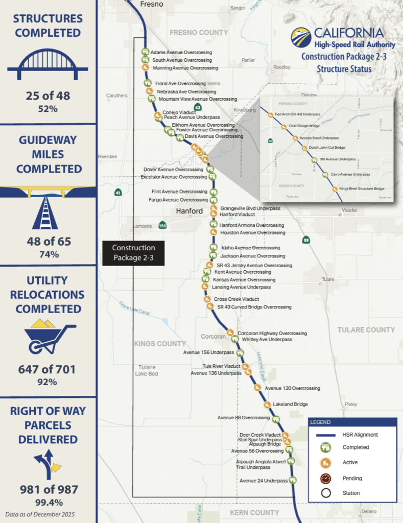 According to CHSRA, work continues daily on the project. Nearly 80 miles of guideway are complete, along with nearly 60 fully completed major structures, and 29 more structures under way across Madera, Fresno, Kings and Tulare counties. The project continues to advance statewide, with 463 miles of the 494-mile Phase I system fully environmentally cleared and construction ready, according to CHSRA. (See construction status maps by structure package above.)