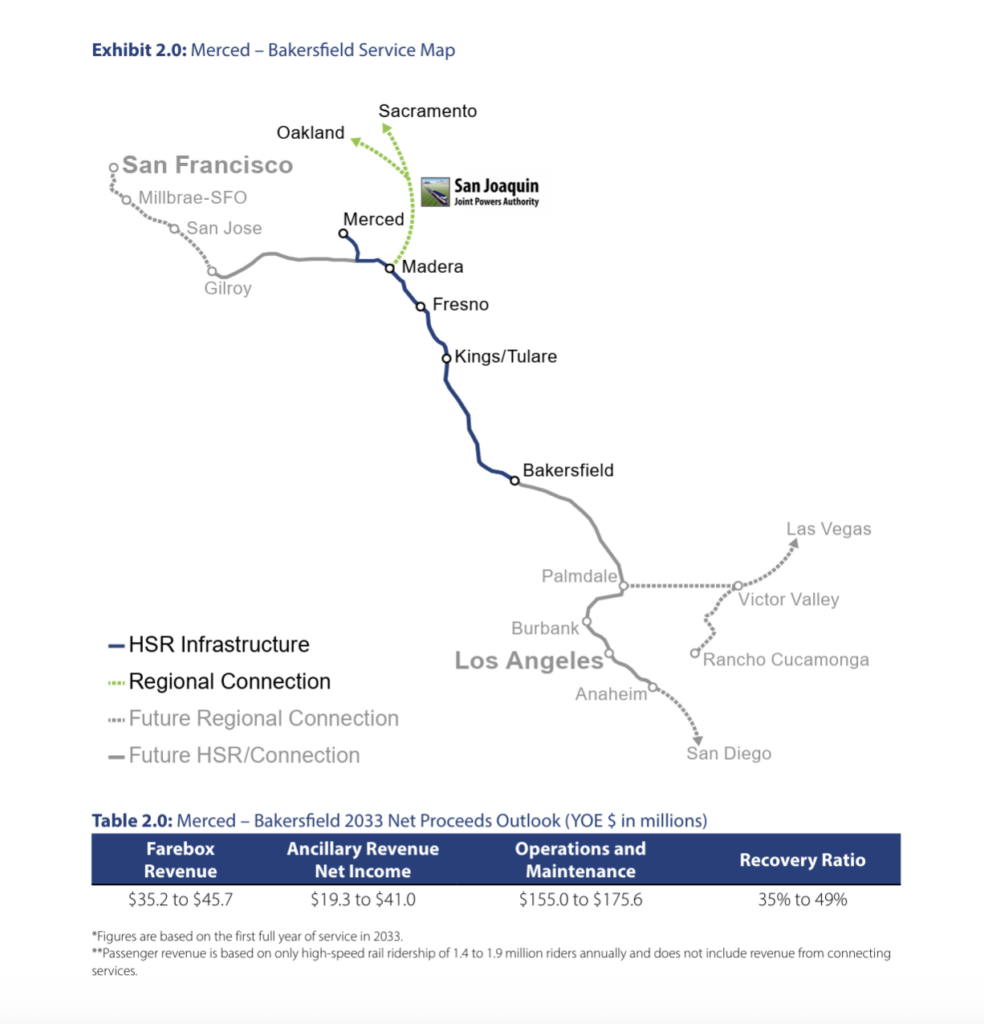 “This 2026 Business Plan sets out the path forward: completion of the [171-mile] Merced – Bakerfield segment [see map below], expansion to major population centers for revenue-positive service, and early asset commercialization to generate additional revenue to build out high-speed rail,” CHSRA CEO Ian Choudri wrote in the plan’s introductory letter. “The plan addresses various policies and implementation tools needed to help avoid construction delays experienced on the 119 miles [spanning Madera, Fresno, Kings, Tulare and Kern counties] where approximately 80 entities held rights of approval and/or permitting. It examines the [Phase I, 494-mile] San Francisco – Los Angeles/Anaheim corridor and lays out a strategy grounded in a realistic delivery schedule, market fundamentals, and disciplined sequencing. It explains how we build from progress under way, prioritize investments that produce early and durable commercial benefits, and create the conditions for long-term financial strength and private-sector participation as the system expands.”