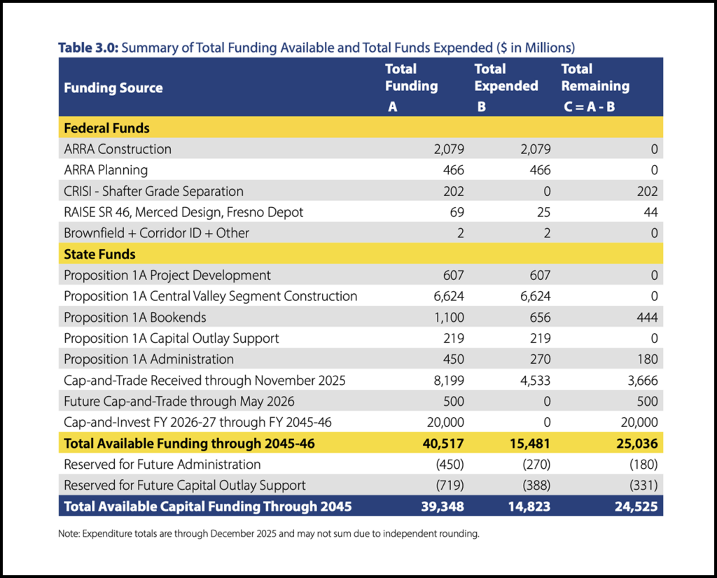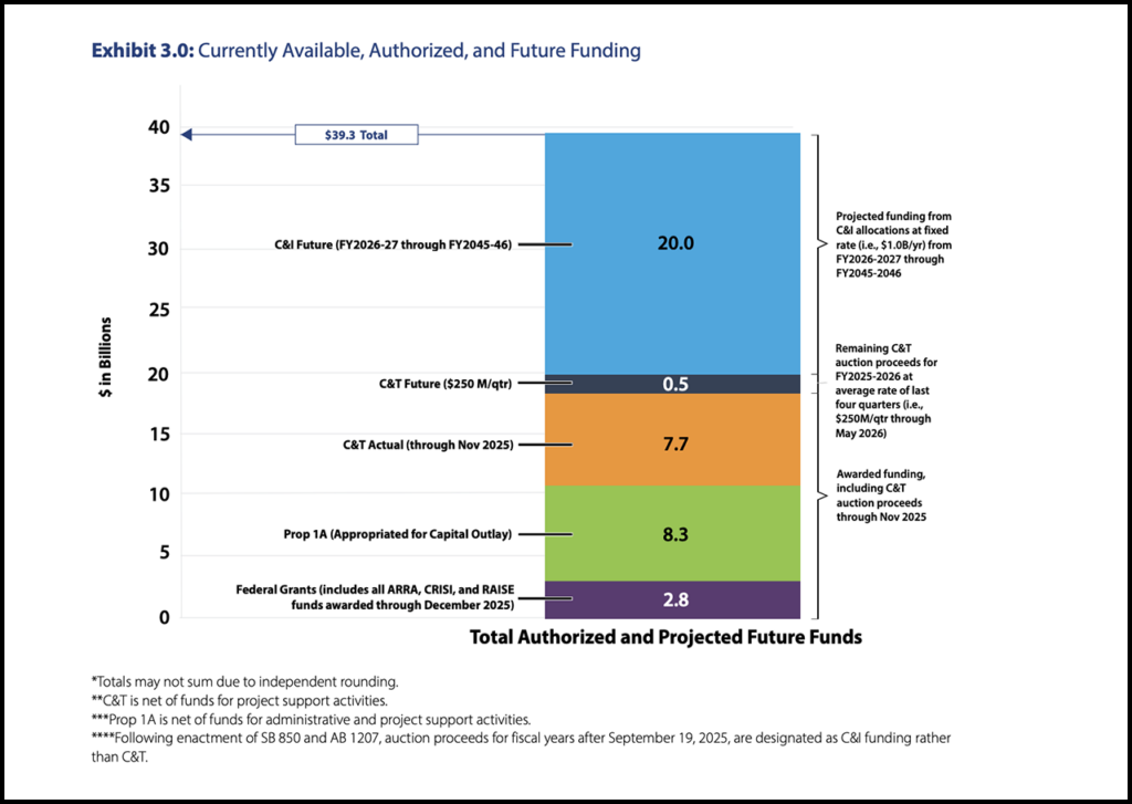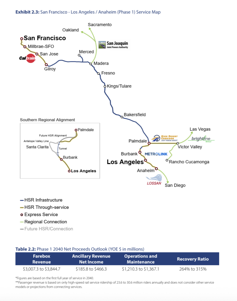“Through partnerships, proposed private financing, and legislative changes, the Authority has laid out a clear, cost-effective approach to taking travelers from San Francisco to Los Angeles,” CHSRA said upon the Feb. 28 release of the draft 2026 Business Plan (see map below). “The Authority also envisions creating new revenue streams through real estate development, ancillary projects, and initial fare service that will help pay for the delivery of transformative transportation.”