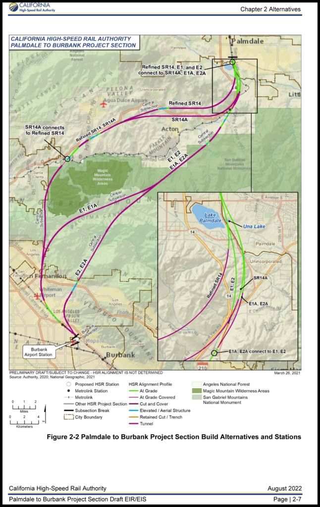 CHSRA’s preferred alternative is the 38-mile SR14A Build Alternative, which would follow an alignment that heads southwest from Spruce Court in Palmdale through the Angeles National Forest, including the San Gabriel Mountains National Monument, and then continues into the San Fernando Valley, where it would connect with the approved Burbank Airport HSR station.
