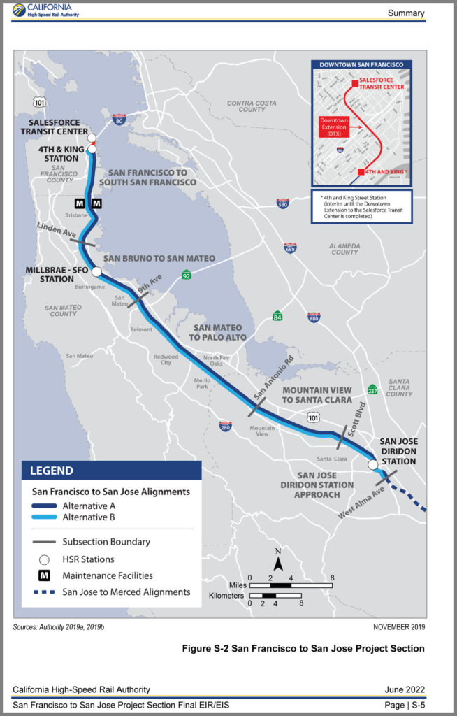 The full San Francisco to San Jose Project Section (see map below) would provide high-speed rail service from the Salesforce Transit Center in San Francisco to the San Jose Diridon Station. It includes about 49 miles of blended-system infrastructure extending through San Francisco, San Mateo and Santa Clara counties with Caltrain and CHSRA trains sharing tracks. CHSRA trains would stop at the 4th and King Street Station in San Francisco (an interim station); the Millbrae Bay Area Rapid Transit (BART)/Caltrain intermodal station, which offers a direct BART connection to the San Francisco International Airport; and the San Jose Diridon Station. Once the Transbay Joint Powers Authority’s Downtown Rail Extension Project extends the electrified peninsula rail corridor from Mariposa Street (south of the interim 4th and King Street Station) to the Salesforce Transit Center, CHSRA trains would use that project’s track to reach Salesforce Transit Center, the ultimate terminal station in San Francisco.