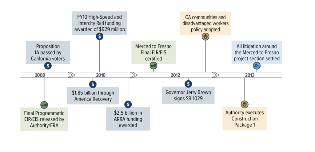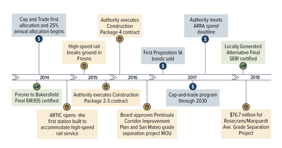 According to the Report the Authority, whose mission is to “deliver an electrified high-speed rail system that will carry passengers between San Francisco and Los Angeles in under three hours,” has secured $3.5 billion in federal funds since California voters first approved an initial down payment of $9 billion in 2008 to build the system. Additionally, the State has provided annual appropriations of Cap-and-Trade Program funds, a program which expires in 2030.