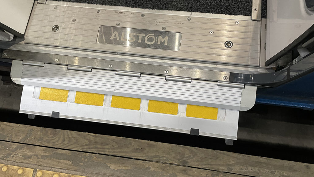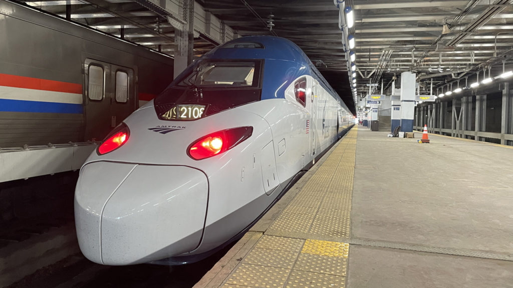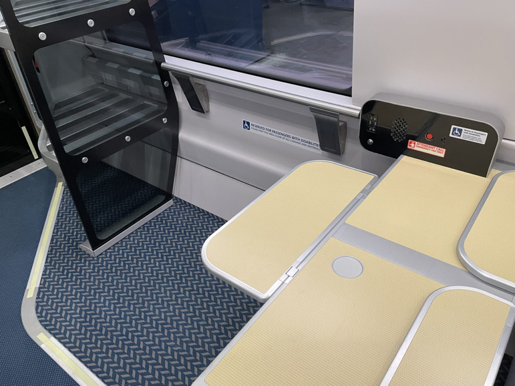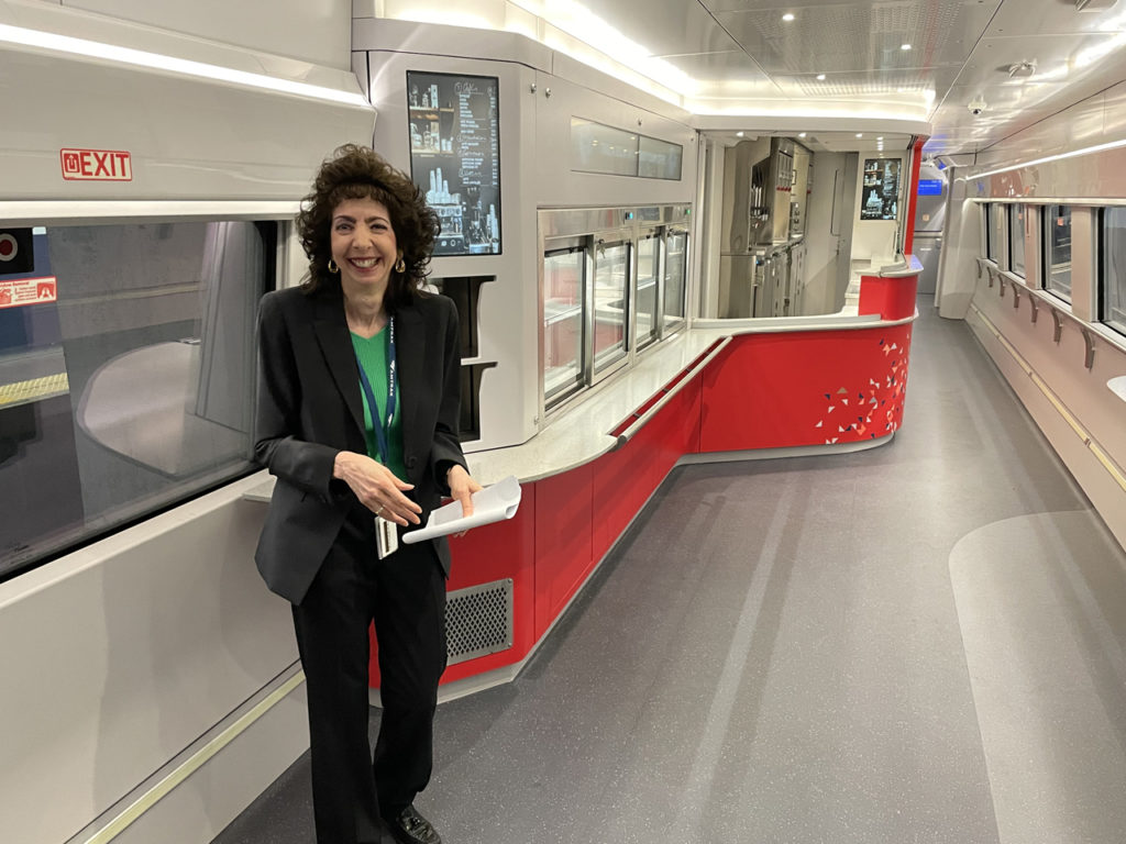 The TGV-based “Avelia Liberty” articulated transits are expected to enter NEC revenue service in early 2023. They have two compact power cars eight articulated intermediate trailer coaches and one centrally located non-articulated café car Certified for operations at up to 186 mph (300 kph), they will operate at a maximum speed of 160 mph on the NEC. Railway Age has covered the trainsets’ manufacturing at Alstom’s Hornell, N.Y. plant and toured an interior mockup in previous articles; this was the first time we’ve seen a completed unit. Suffice to say the overall design and amenities are a vast improvement over the existing Acela trainsets.