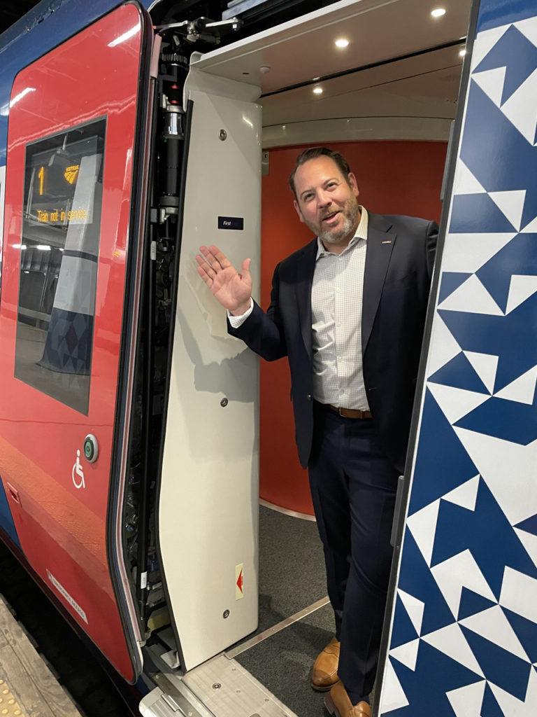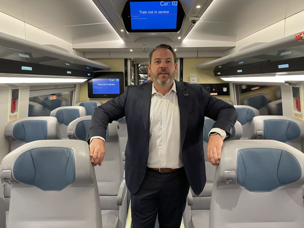 On May 23, Railway Age Publisher Jon Chalon and Editor-in-Chief William C. Vantuono toured Amtrak’s new Alstom-built Acela II high-speed Northeast Corridor trainset at Philadelphia 30th Street Station. Three of the 28-unit order are on the property.