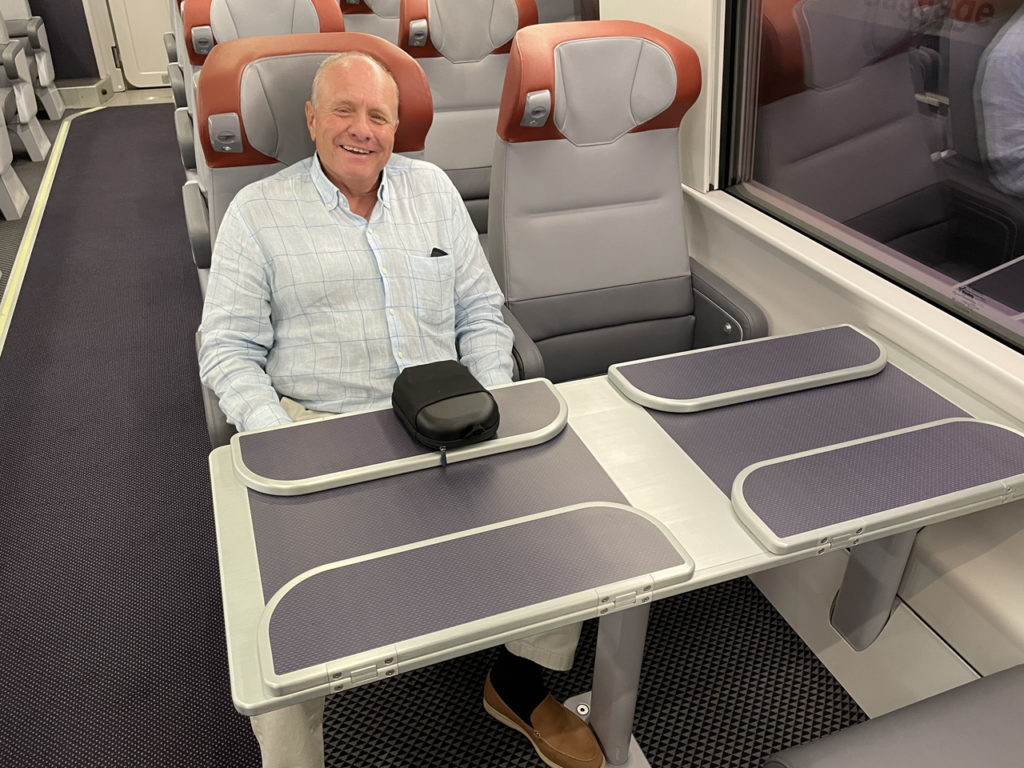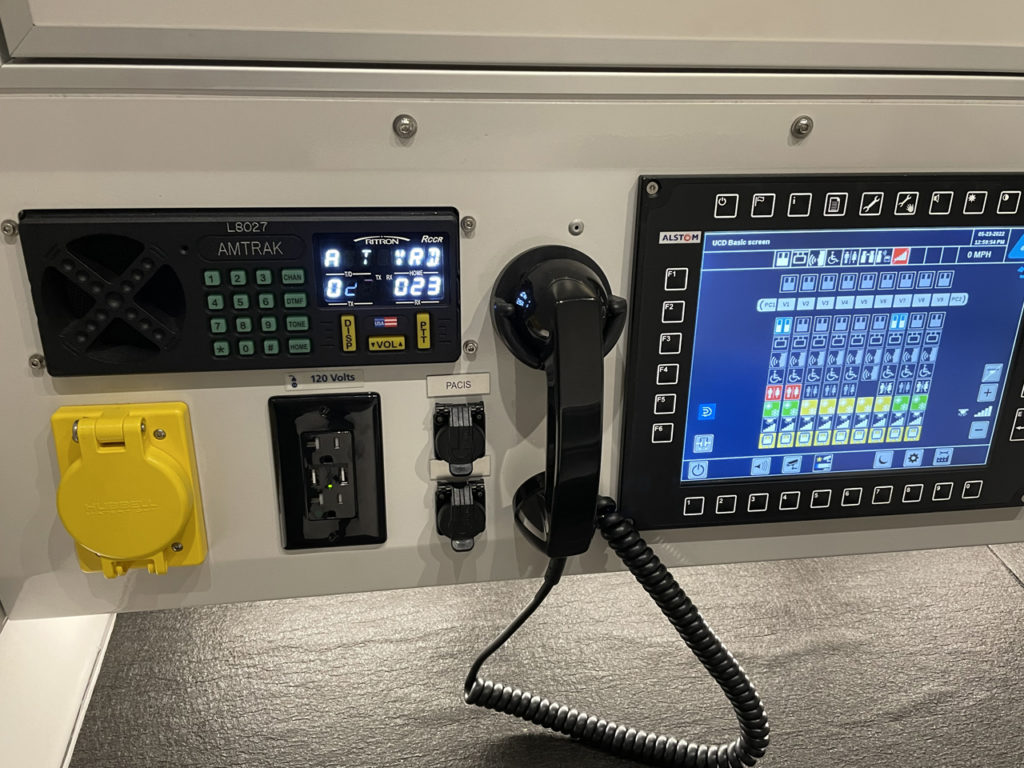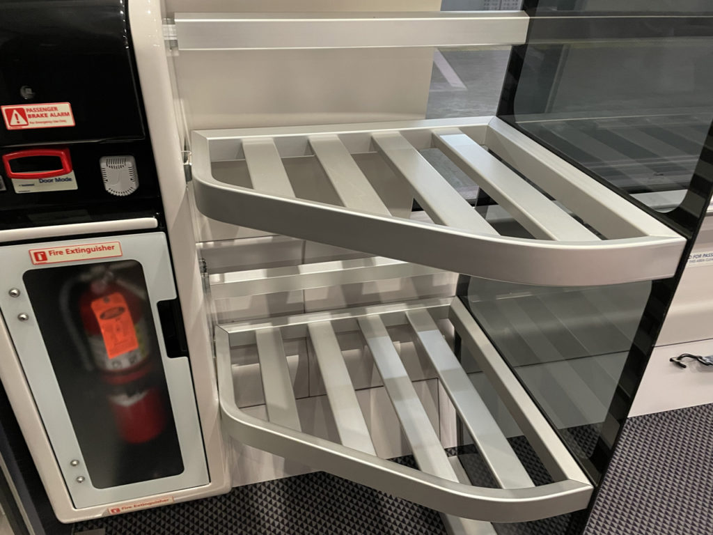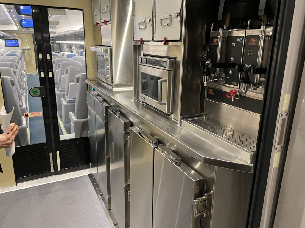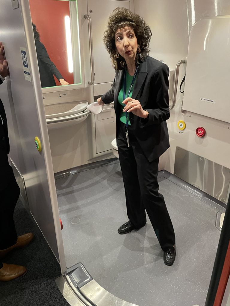 Alstom trainset project manager Noah Heulitt, one of Railway Age’s 2018 “10 Under 40” honorees. Heulitt, previously General Manager of NJ Transit’s Bombardier-operated RiverLINE light rail in 2015, joined Alstom prior to the acquisition of Bombardier.Jon Chalon tries out the First Class section facing tables. Each spot has an individual fold-down section. Tables in Business Class are of the same design.The ADA section in each car has its own table position with a fold-down section.Amtrak Acela II project lead Michelle Tortolani shows off the café car.First Class is 1-2 seating with slightly wider seats than Business Class. Lightweight fold-down tray tables with independent fold-down cupholders (see following photos) are a much-improved design.In addition to traditional railcar overhead luggage racks, each car features extra storage near the doors.The gangways between the articulated cars feature touch-control automatic glass doors.All restrooms are fully ADA-accessible and feature changing tables for passengers with infants.Conductor’s office is located in the café car at the center of the trainset.Each door is equipped with an automatic retractable bridge plate.Like a traditional railroad dining car, the café car features a separate door for loading supplies.The café car features all-stainless-steel equipment, including a Waring toaster (below). If you know a bit about very old popular music, Fred Waring of “Fred Waring and His Pennsylvanians” fame was the financial backer behind the Waring Blender in the 1930s. The company manufactures high-end commercial appliances.2-2 Business Class section.The First Class car has its own galley.The café car features a “grab ’n go” section. The menu (below) is on a digital display.Buffers between the independent non-tilting power cars and active-tilt articulated coaches.All 8 passenger coaches and the café car have longitudinal dampers and air suspension (below). The café is located in the center of the trainset and is independent (non-articulated).Overall, very impressive (not me, the trainset!).