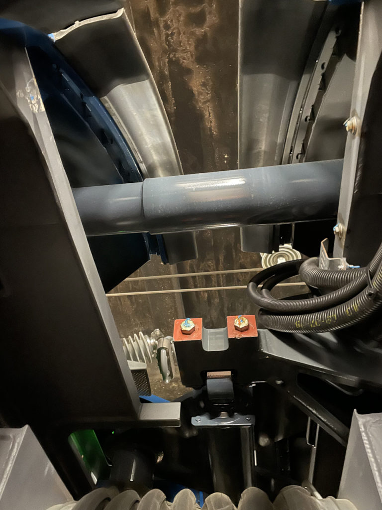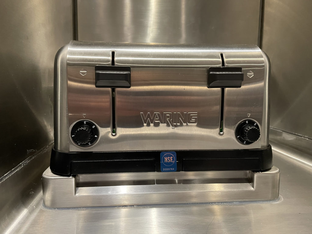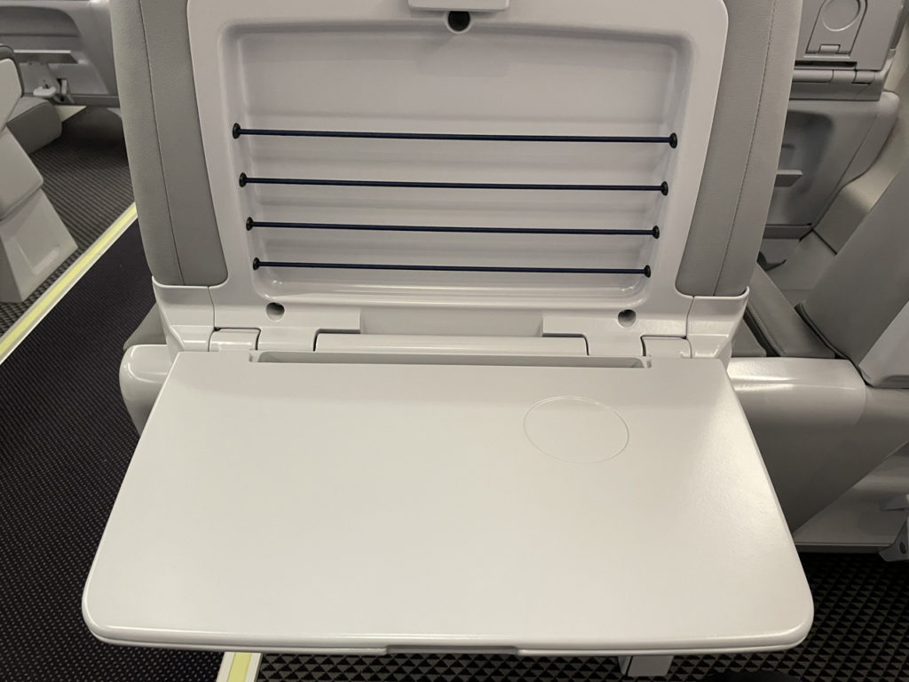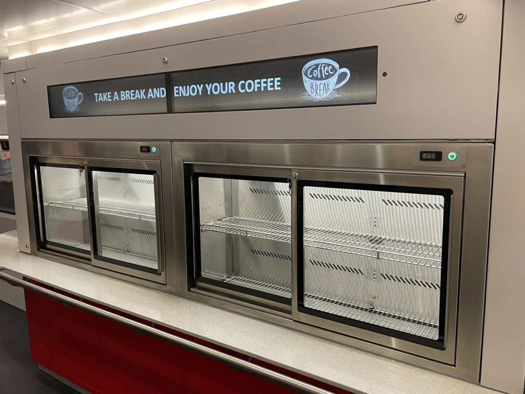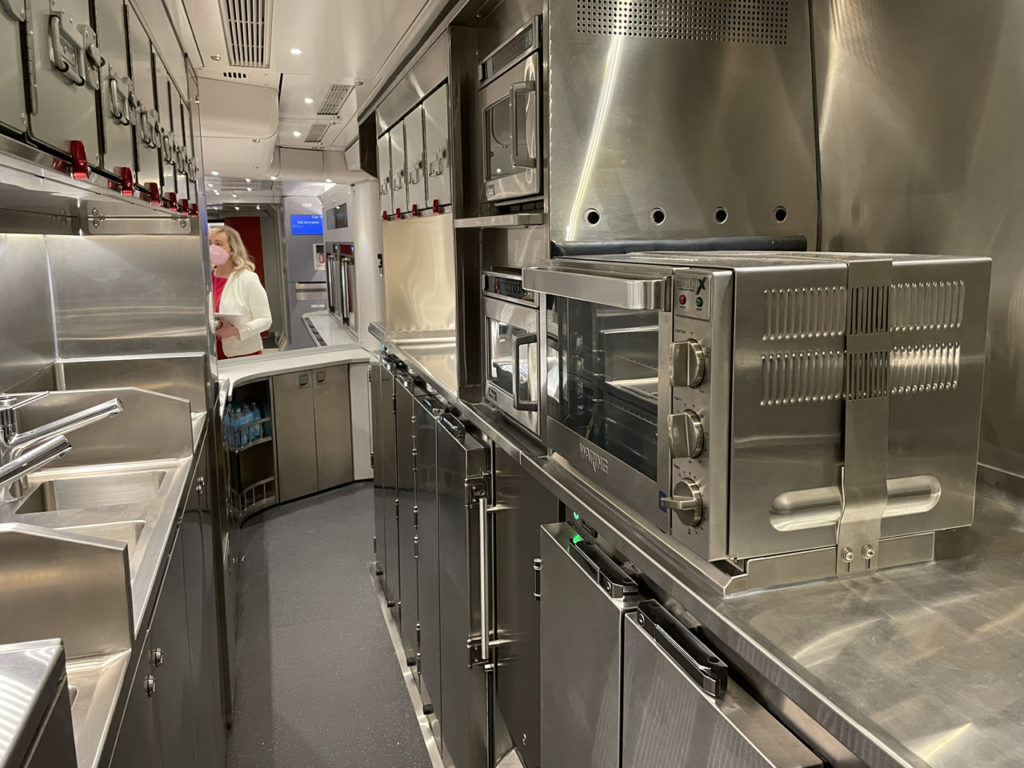 Alstom trainset project manager Noah Heulitt, one of Railway Age’s 2018 “10 Under 40” honorees. Heulitt, previously General Manager of NJ Transit’s Bombardier-operated RiverLINE light rail in 2015, joined Alstom prior to the acquisition of Bombardier.Jon Chalon tries out the First Class section facing tables. Each spot has an individual fold-down section. Tables in Business Class are of the same design.The ADA section in each car has its own table position with a fold-down section.Amtrak Acela II project lead Michelle Tortolani shows off the café car.First Class is 1-2 seating with slightly wider seats than Business Class. Lightweight fold-down tray tables with independent fold-down cupholders (see following photos) are a much-improved design.In addition to traditional railcar overhead luggage racks, each car features extra storage near the doors.The gangways between the articulated cars feature touch-control automatic glass doors.All restrooms are fully ADA-accessible and feature changing tables for passengers with infants.Conductor’s office is located in the café car at the center of the trainset.Each door is equipped with an automatic retractable bridge plate.Like a traditional railroad dining car, the café car features a separate door for loading supplies.The café car features all-stainless-steel equipment, including a Waring toaster (below). If you know a bit about very old popular music, Fred Waring of “Fred Waring and His Pennsylvanians” fame was the financial backer behind the Waring Blender in the 1930s. The company manufactures high-end commercial appliances.2-2 Business Class section.The First Class car has its own galley.The café car features a “grab ’n go” section. The menu (below) is on a digital display.Buffers between the independent non-tilting power cars and active-tilt articulated coaches.All 8 passenger coaches and the café car have longitudinal dampers and air suspension (below). The café is located in the center of the trainset and is independent (non-articulated).Overall, very impressive (not me, the trainset!).
