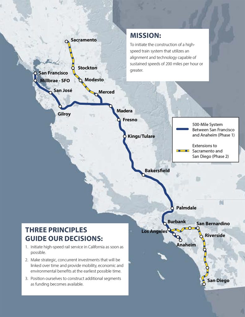 In 2008, California’s voters approved Prop 1A, which set aside $10 billion to begin construction on a high-speed rail line that would connect Los Angeles and San Francisco, running through the Central Valley, in 2 hours and 40 minutes. It would cost, they thought, $33.6 billion, and Californians would be able to ride by the year 2020.