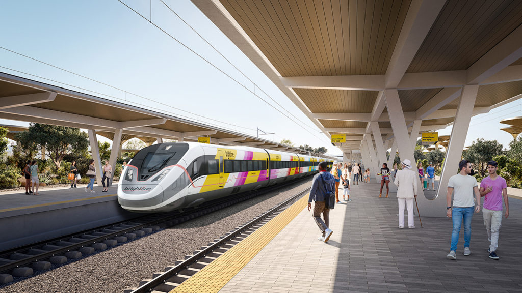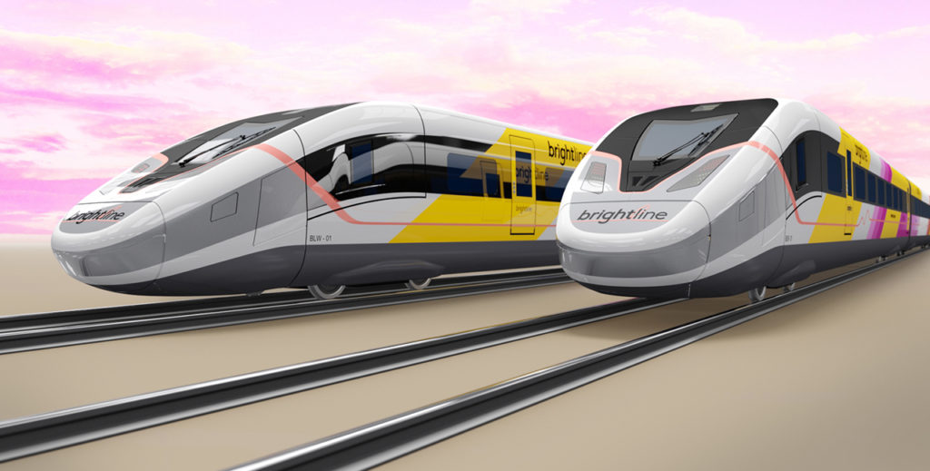Brightline added that the AP 220s “will be the first true high-speed trainsets to be built in America. The propulsion system, lighter weight and aerodynamic shape makes it more efficient than other high-speed trains. The AP220 features an ultrawide carbody designed for unparalleled passenger comfort and designed to be the most accessible train on the market, exceeding ADA requirements and allowing for [passengers] in wheelchairs to move with ease from car to car. The trainsets will carry between 434-450 passengers, depending on final configuration, and can make the trip in less than two hours.”
