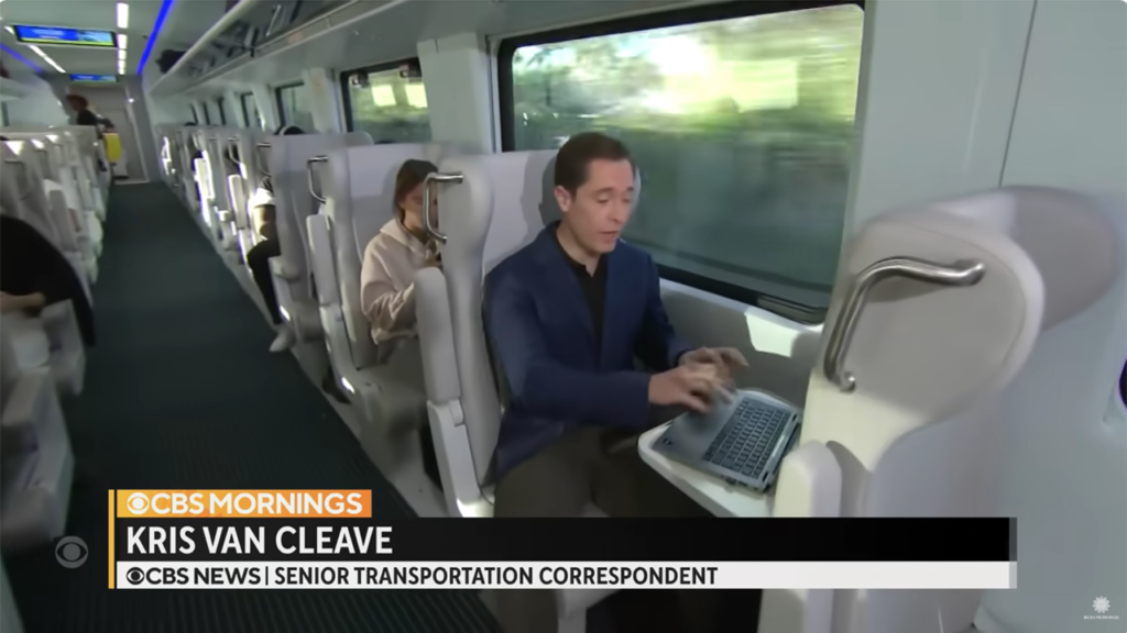 CBS Mornings correspondent Kris Van Cleave produced an excellent report on the prospects for high-speed rail in the United States, focusing on Brightline’s successful Miami-Orlando service, which offers 125-mph operations on a dedicated right-of-way between West Palm Beach and Orlando, with plans to extend the line to Tampa.