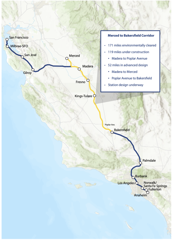 California high-speed rail is currently under construction along 119 miles in the Central Valley, where there are more than 25 active job sites (see map below). Additional advanced design is proceeding on stations and the 52 miles of extensions into downtown Merced and into downtown Bakersfield. The 494-mile, Phase I system will extend from San Francisco to Los Angeles/Anaheim; 422 miles have already been environmentally cleared. The system could eventually extend to Sacramento and San Diego, totaling 800 miles with up to 24 stations.