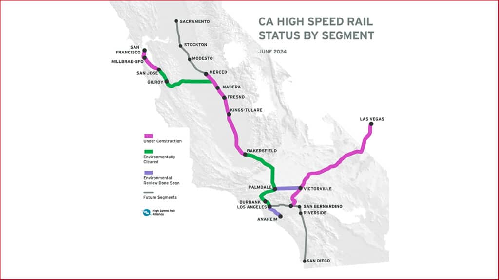 FRA added that “the slow progress by CHSRA contrasts with the impressive work of Brightline West to build a high-speed rail system. Brightline West plans to begin service between the Los Angeles region and Las Vegas in 2028. At the direction of Secretary Duffy, FRA will review CHSRA and the progress on the Merced-to-Bakersfield Corridor. The detailed review will look at CHSRA’s compliance under the FRA-administered grant agreements to determine whether CHSRA has fully met its obligations under the award terms.”