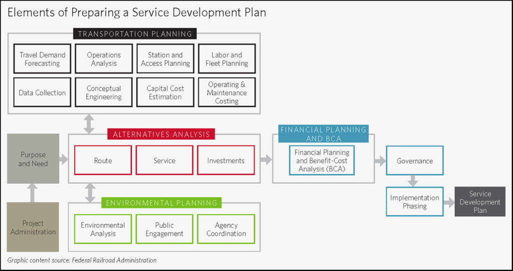 Service development plans are not new; these documents have long been an important step in the process of planning new or expanded passenger rail corridors, laying out the feasibility and the need for increased service. What is new is their expanded role in the process of selecting projects for funding from new and expanded programs under the IIJA, also known as the Bipartisan Infrastructure Law. Core elements of a service development plan include a Purpose and Need statement, planning and engineering analyses, evaluation of alternatives including environmental factors, identification of a rail service governance structure, and outreach to obtain input from stakeholders including agencies and the public.
