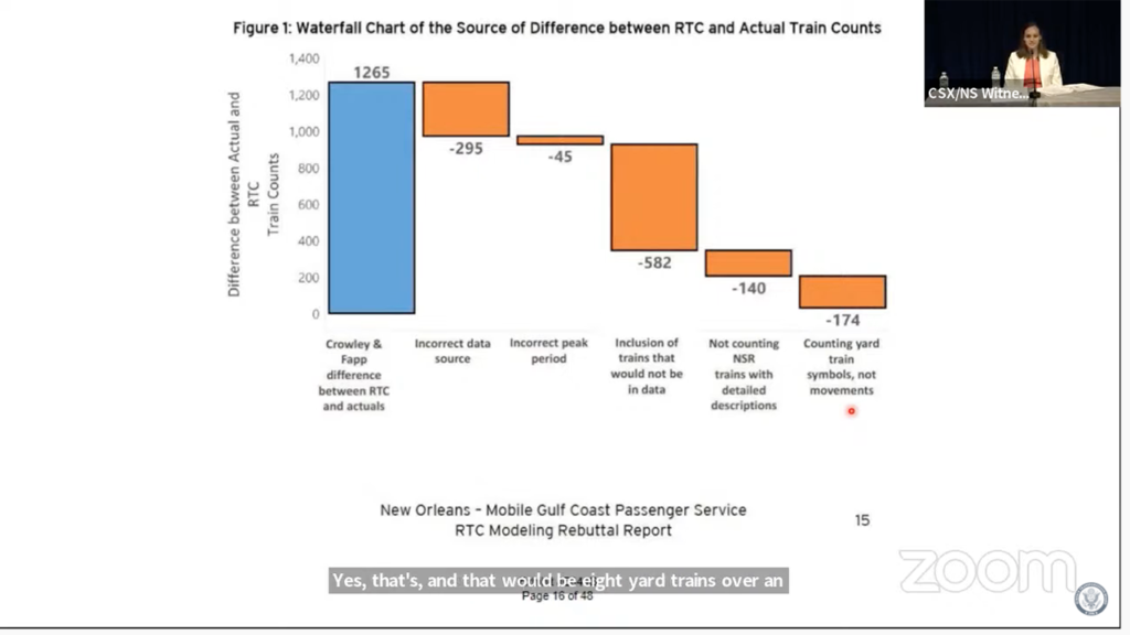 Holly Sinkkanen, Manager of Strategic Capacity at NS, was next. She said the purposes of the model were to evaluate growth, support the railroad’s passenger policy and determine the effects of operating changes. She also claimed that Amtrak’s criticism was inaccurate and maintained that adding the proposed trains on NS’s Back Belt in New Orleans without the infrastructure projects requested by the railroad would “severely impact our interchange partners.”