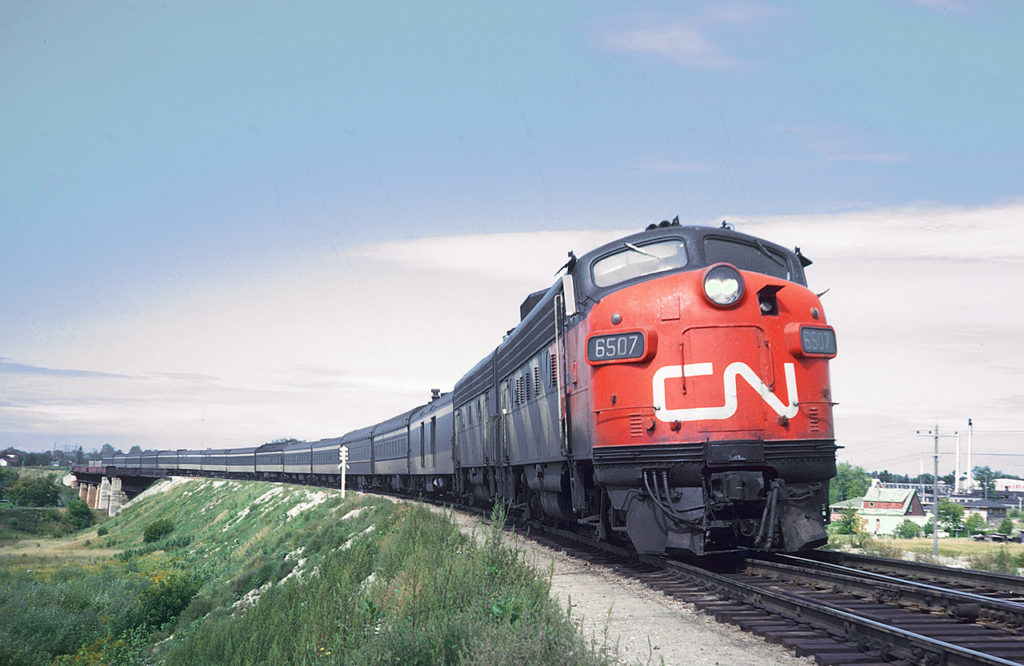 Canadian National FP9 6507 with Train 2, the Super Continental coming into Pembroke, Ontario, Sept. 6, 1965. Marty Bernard/Wikimedia Commons.