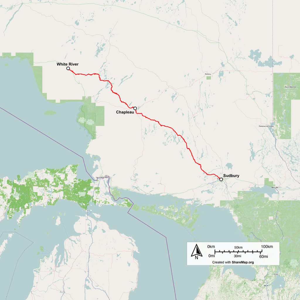 That route hosts VIA Rail Trains 185 and 186, formerly officially named the Lake Superior, but which the people along its route affectionately remember as the “Budd Train.” It is the only train on VIA Rail that runs on historic CP track (the signs have been changed to say “CPKC”), except for a few short stretches of the transcontinental Canadian. It runs between White River and Sudbury, Ontario, on a segment of the original Canadian route, from the days when CP Rail operated the train. It is isolated from any other passenger routes, and White River is a long way from other places.