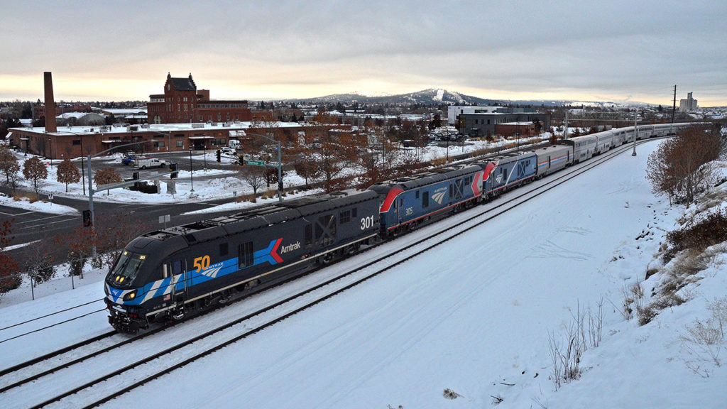 Three Siemens Mobility-built ALC-42s led Train No. 7, the Empire Builder, into Spokane, Wash., nearly six hours late on Dec. 19, 2022. The diesel-electric locomotives broke down multiple times during the trek through sub-zero winter conditions across North Dakota and Montana. Bruce Kelly photo