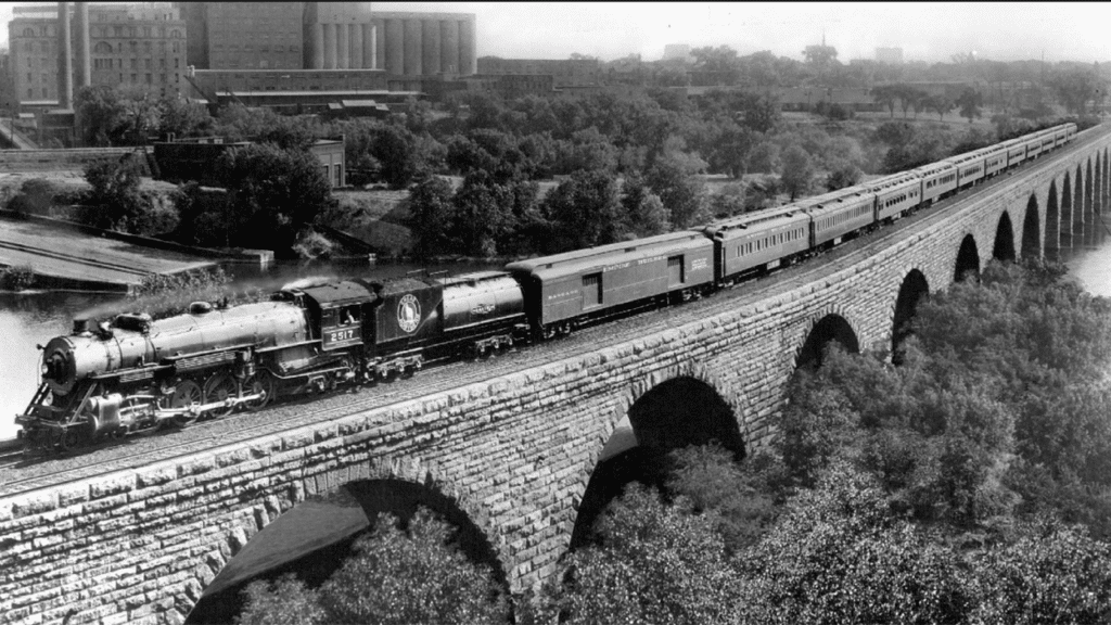 Great Northern’s first iteration of the Empire Builder was equipped with Pullman-green heavyweight equipment hauled by a P-2 class 4-8-2. Here, the train crosses the stone arch bridge over the Mississippi River at Minneapolis. Although no longer in service by railroads, the bridge is a landmark in the Twin Cities. Great Northern photograph.
