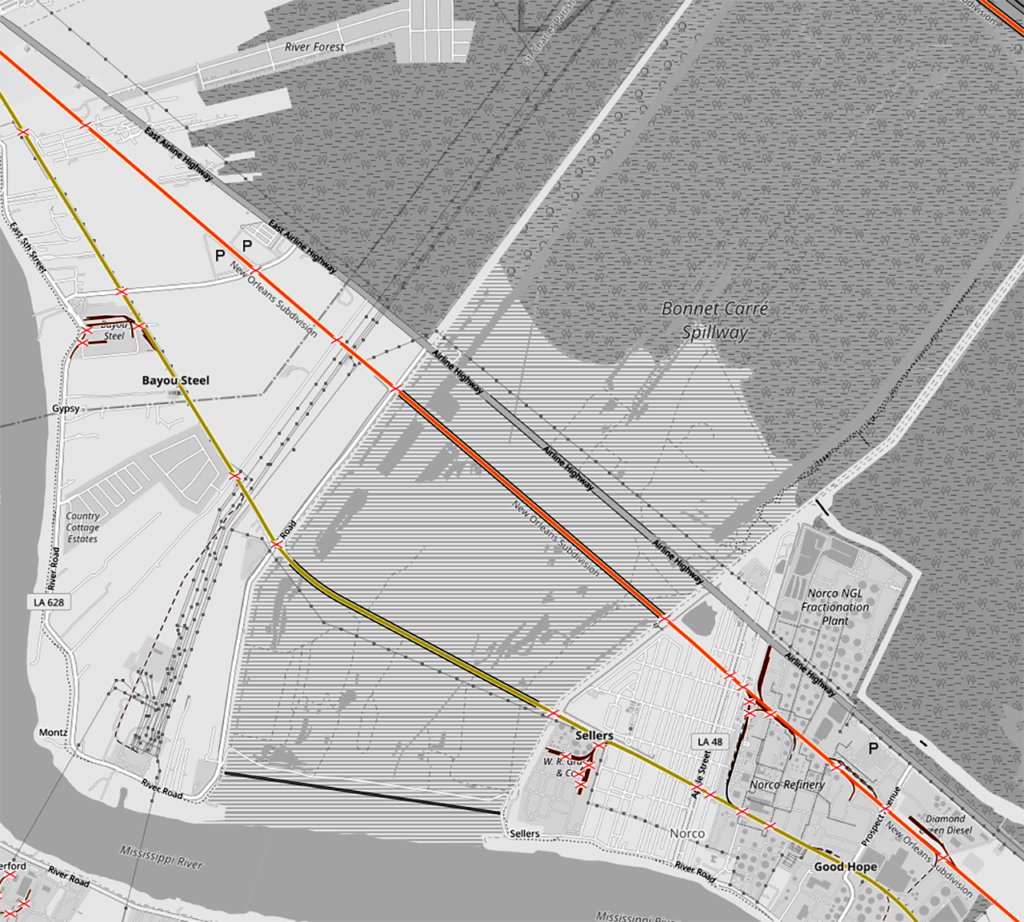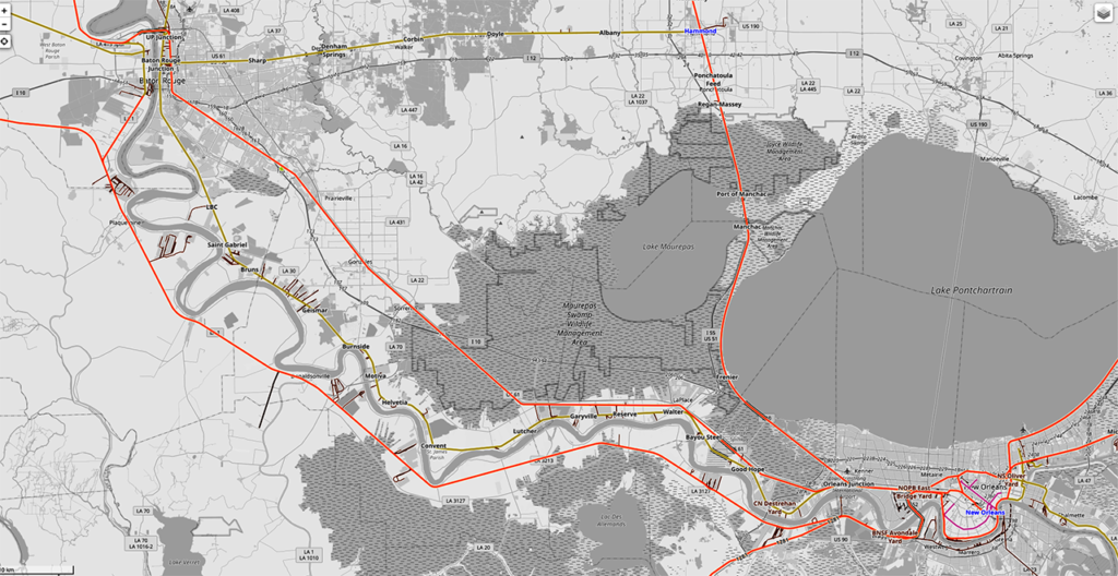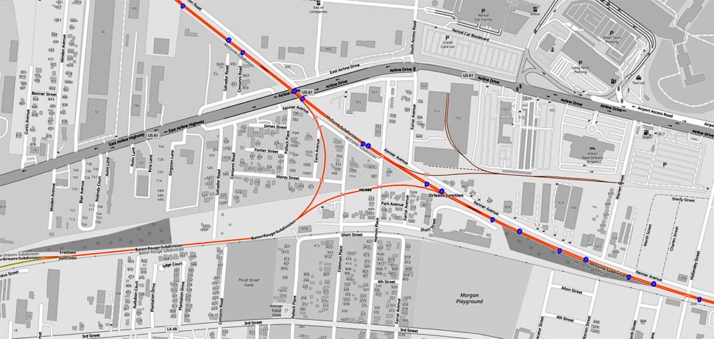 According to officials, Amtrak will use Canadian Pacific Kansas City (CPKC) and CN rights-of-way located along the I-10 corridor that are one of three routes connecting New Orleans and Baton Rouge. The CPKC/CN tracks, Amtrak says, were chosen because they were “the most direct and had less conflict with freight transportation.” The CPKC New Orleans Subdivision (former KCS) accounts for most of the routing. Trains, after traversing a short distance on CPKC’s Baton Rouge Subdivision (former KCS) would connect with CN’s McComb Subdivision at New Orleans Junction to reach New Orleans Union Passenger Terminal.