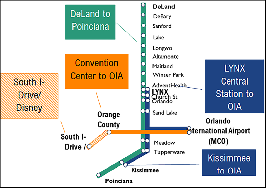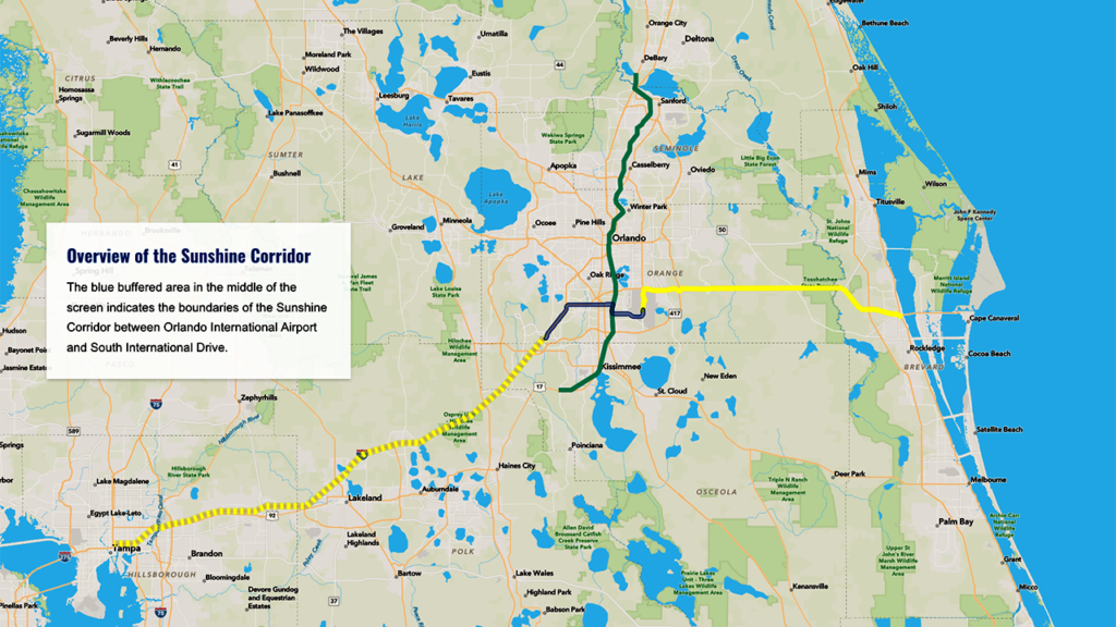 A website with detailed information about the project summarizes the project this way: “The Sunshine Corridor is a multimodal passenger rail program. It proposes expanding premium passenger rail transportation to improve mobility, connectivity and accessibility to major employment centers while stimulating economic development opportunities to support the rapidly growing Central Florida region.”